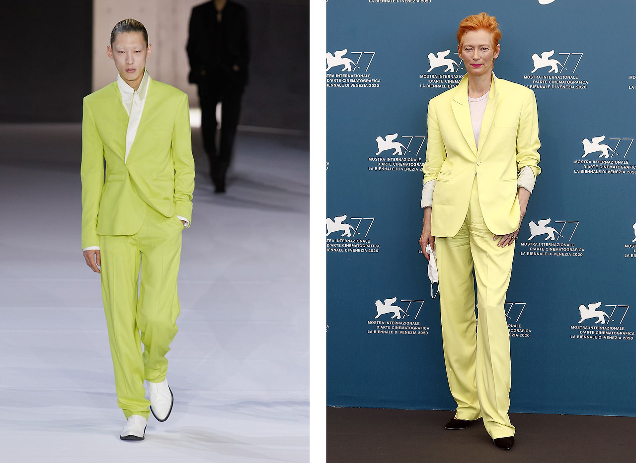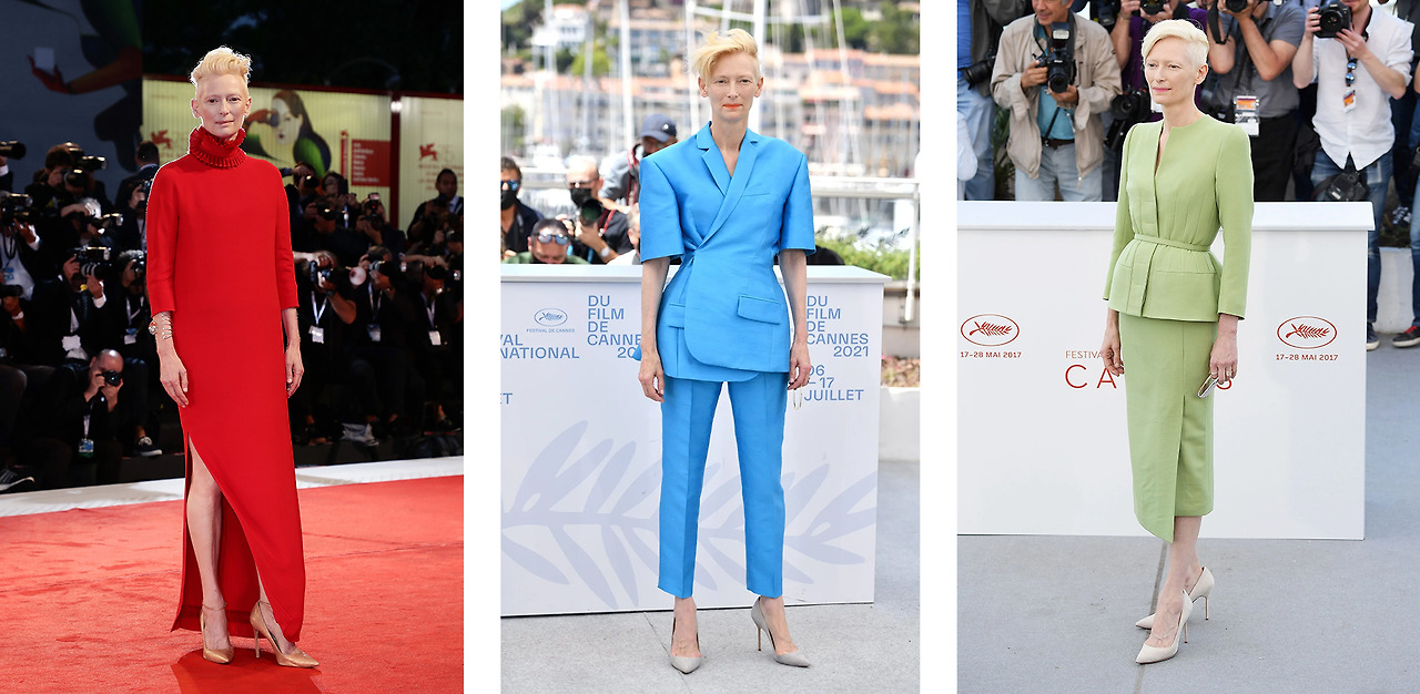 압도적인 연기력의 배우 틸다 스윈튼은 179cm 모델처럼 큰 키와 뱀파이어를 연상케 하는 가녀린 흰 피부, 사람들을 압도하는 카리스마로 존재감을 확실히 하고 있다. 중성적이면서도 우아함이 흐르는 틸다 스윈튼의 패션에서도 절친 하이더 아커만의 지대한 영향을 쉽게 찾아볼 수 있다.