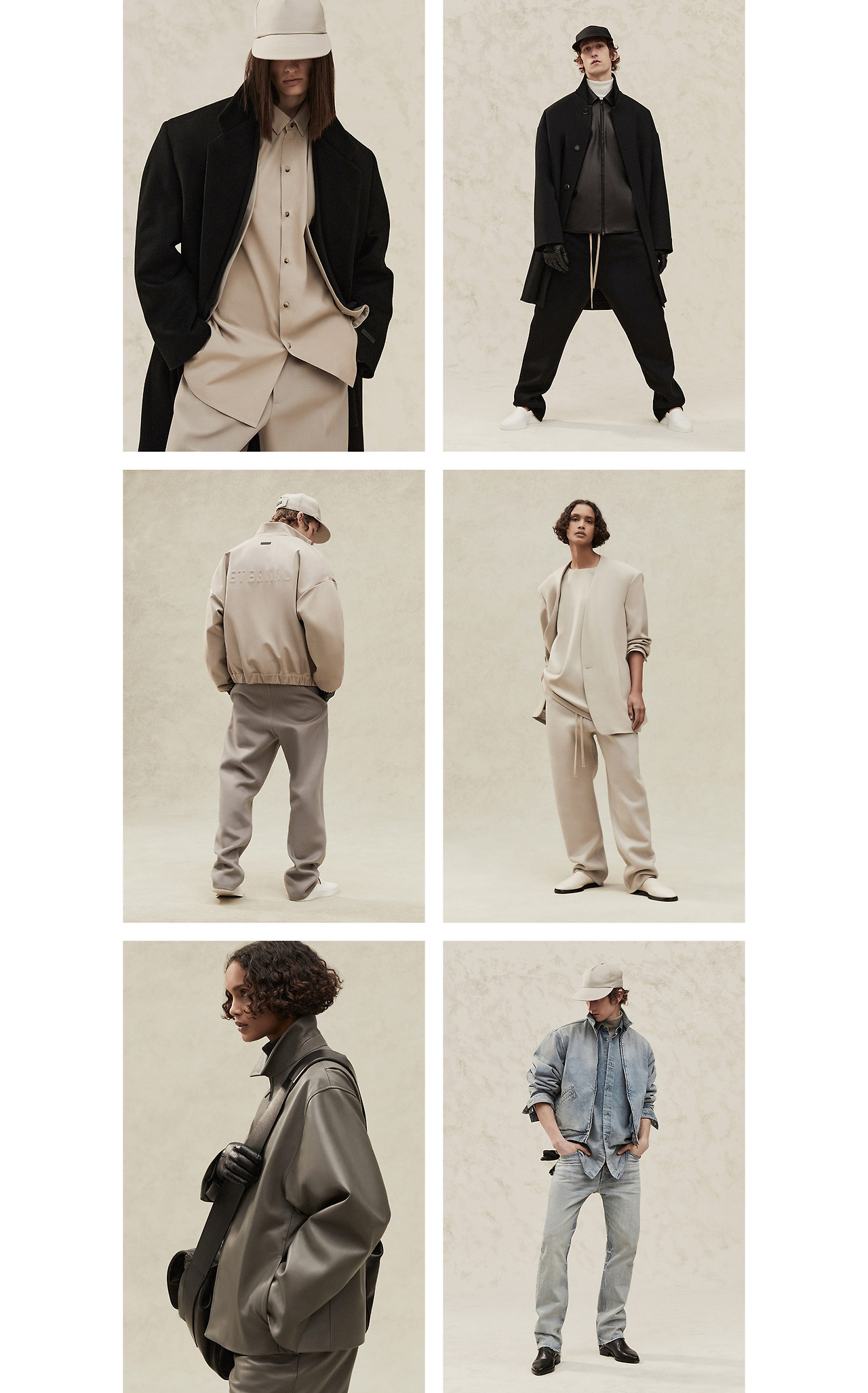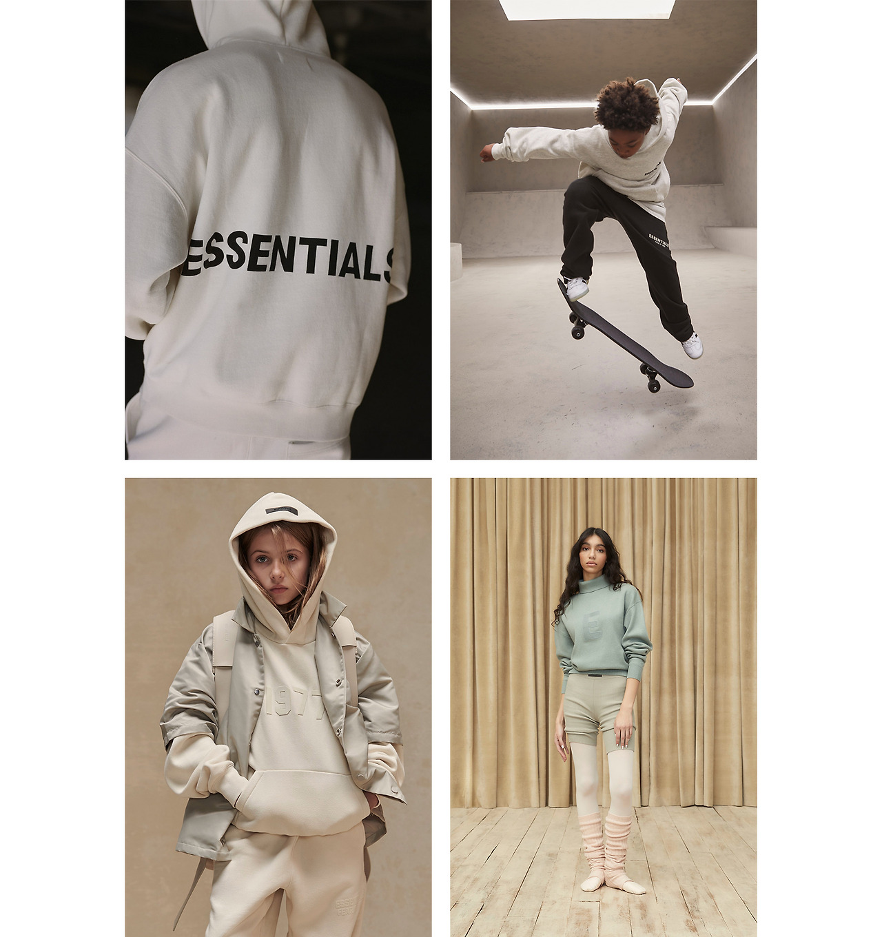 FEAR OF GOD의 보급형이라 볼 수 있는 Essentials 라인은 오리지널보다 더 큰 수익을 가져다주는 기특한 효자 라인. 국내에선 꾸안꾸룩의 기본으로 많이 추천되는 아이템이다. 오리지널 보다는 약간 힘을 뺐지만 브랜드 특유의 색감을 잃지 않으며 편안한 실루엣과 실용성을 극대화시킨, 말 그대로 ‘에센셜한’ 구성이라 보면 된다. 성별에 구애받지 않는 디자인과 키즈 라인까지 마련되어 있어 세련된 패밀리 룩을 원하는 이들에게 안성맞춤.