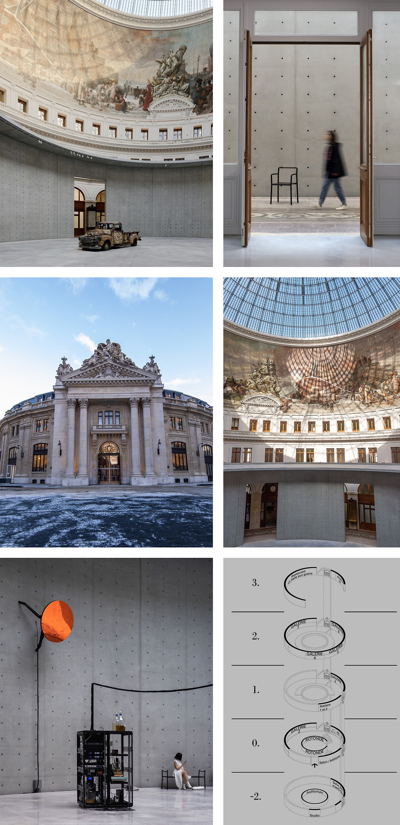 안도 타다오는 400년 역사에 경의를 표하며 현대 미술의 공간이자, 파리 예술의 진원지로 탈바꿈시켜놓았다. 채광 창에서 나오는 일광이 건물 내부 전체에 고르게 분산되도록 30피트 높이의 콘크리트 실린더를 삽입했으며, 모든 층을 연결하는 중심점 역할의 나선형 콘크리트 계단을 설계했다.