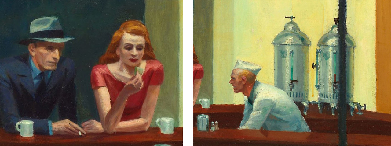 외딴 섬처럼 보이는 이들을 계속해서 그림에 등장시킨 것은 호퍼가 무의식적으로 쓸쓸한 대도시를 그리고 있었음을 나타내기도 하지만, 동시에 반쪽짜리 인간으로 함께 살아가고 있는 타인이 있음을 알려주는 것이기도 하다.