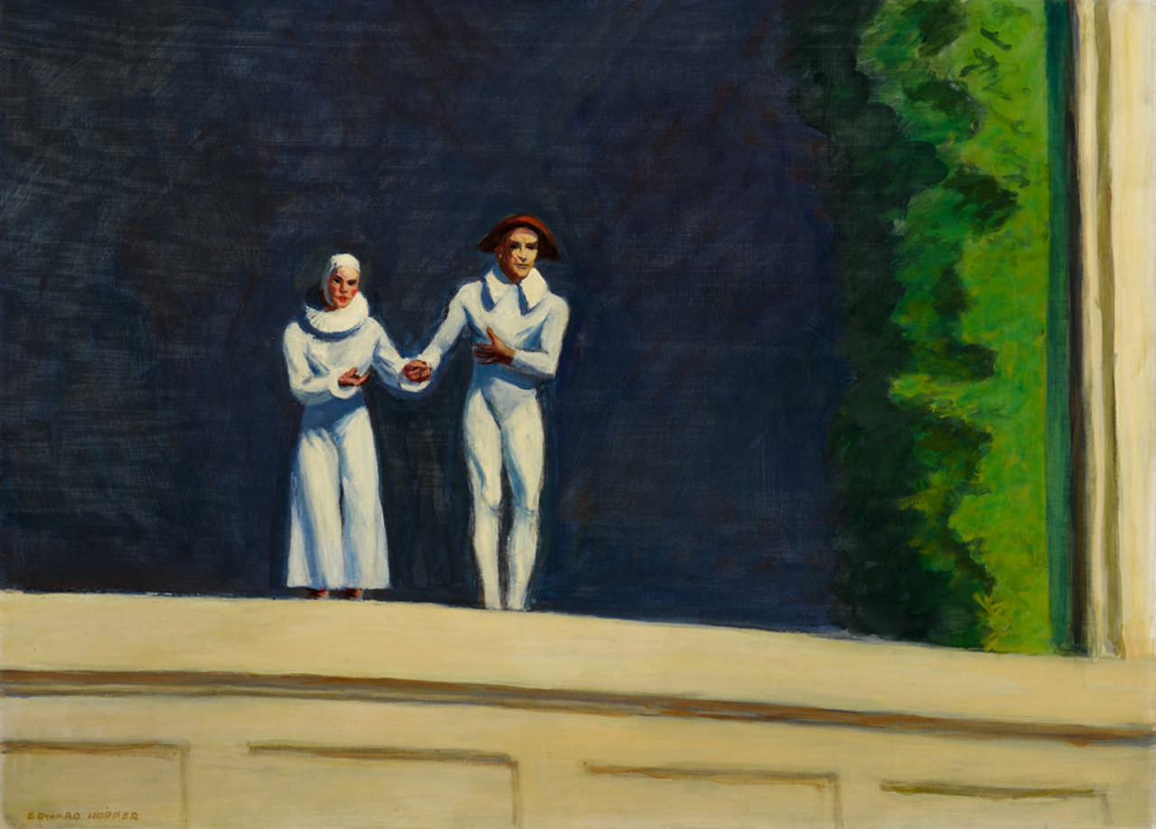 호퍼가 숨을 거두기 일 년 전, 본인의 마지막을 직감하고 그렸던 작품 두 희극 배우(Two Comedians)를 보고 있으면 “인생은 멀리서 보면 희극이지만 가까이서 보면 비극”이라는 찰리 채플린의 말이 떠오르기도 한다. 무대를 마친 후 관중석을 향해 마지막 인사를 건네고 있는 두 희극인은 다름 아닌 호퍼 부부이다. 무대 뒤편, 예측할 수 없는 어둠 속으로 담담하게 걸어가겠다고 알리는 것 같다.