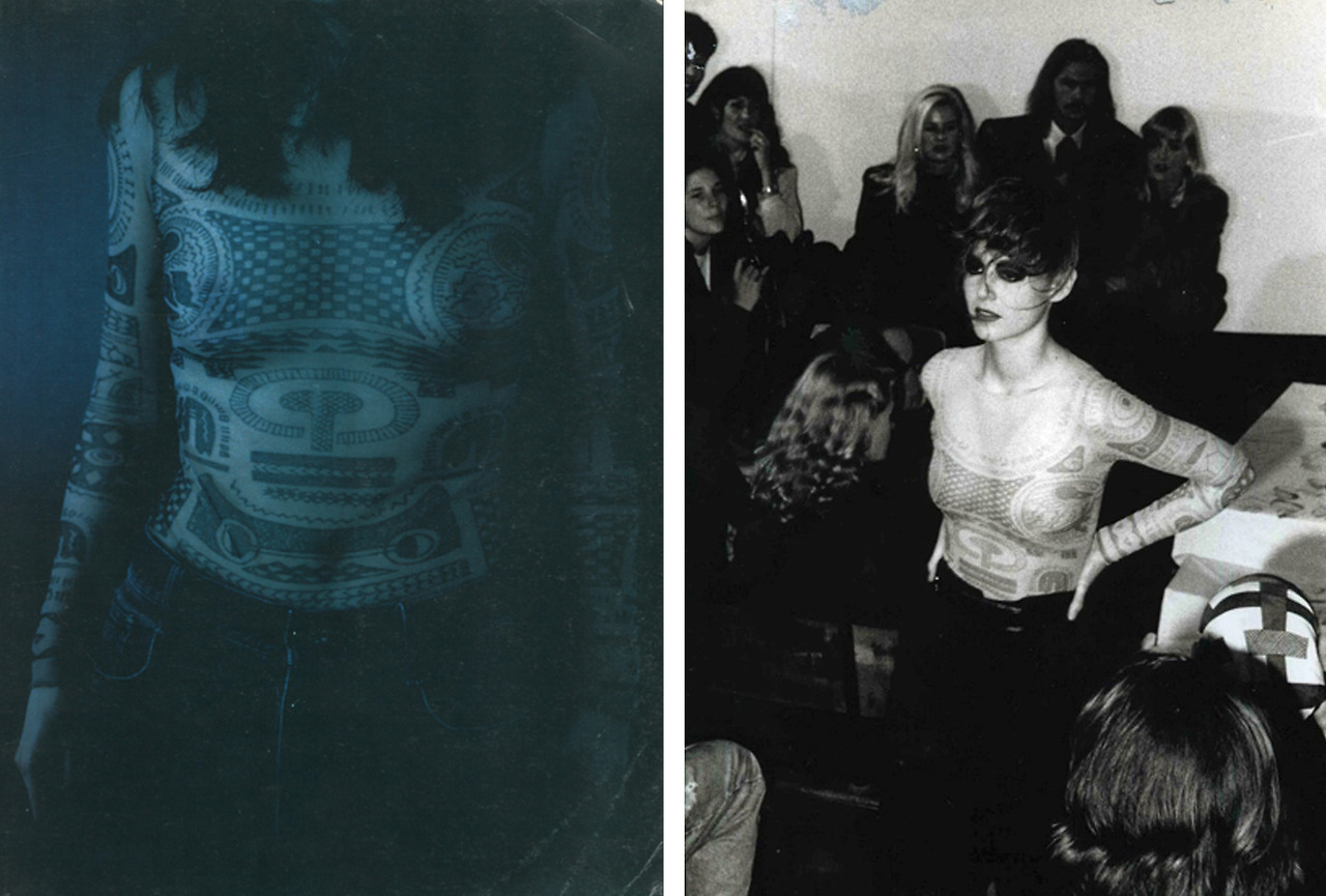 마틴 마르지엘라가 펼친 새로운 역사의 서막, Maison Martin Margiela의 첫 번째 컬렉션 1989 SS를 좀 더 자세히 들여다보자. 그중 시선을 붙드는 흑백 사진 한 장. 짙은 눈 화장을 한 여성이 양손을 허리에 고정하고 어딘가를 응시하고 있다. 이 착장은 마치 모델이 옷을 입지 않고 몸에 부족 문양이 그려져 있는 것처럼 보이는데, 마틴 마르지엘라가 의도적으로 연출한 착장이자 1989 SS 데뷔 쇼에서 가장 널리 알려진 작품 중 하나다.