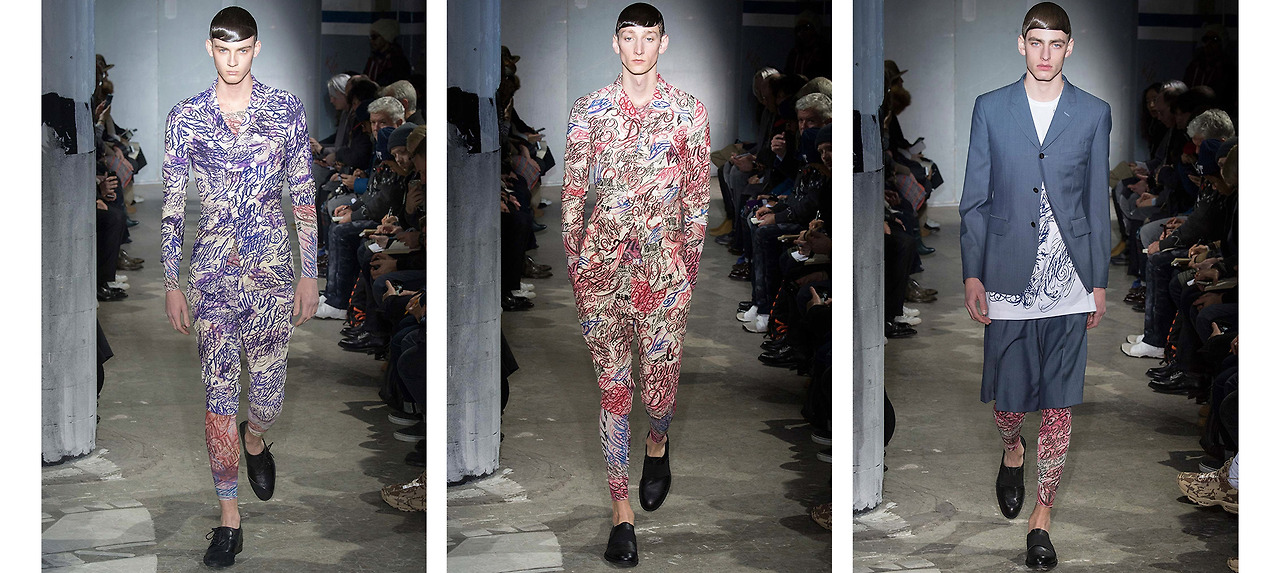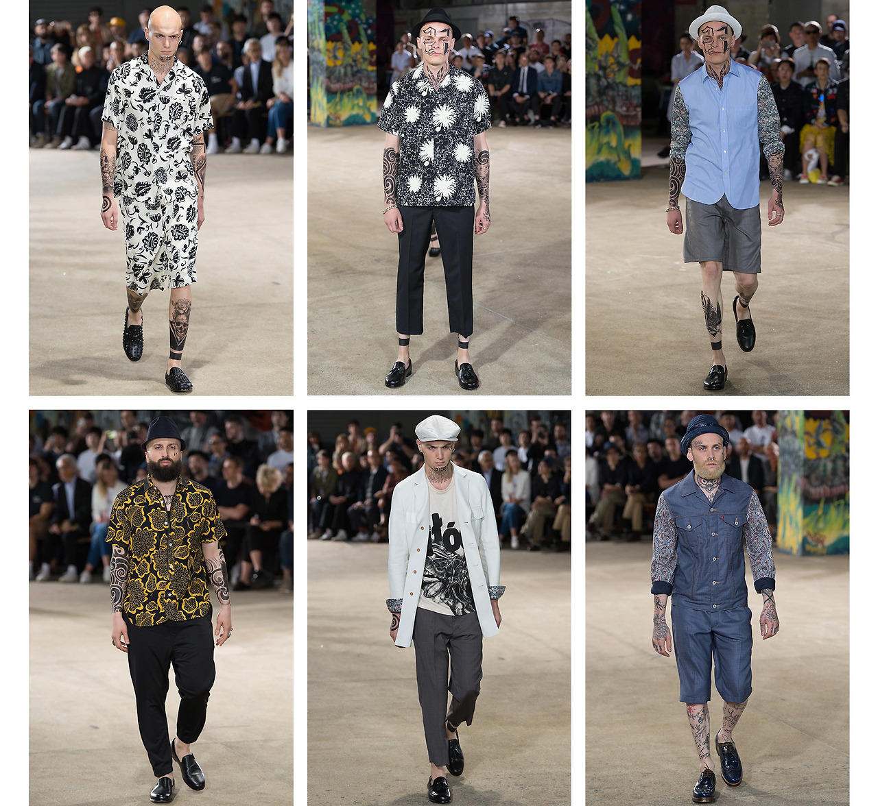 남들이 자주 걷는 지름길이 아닌 자신만의 아방가르드 스타일로 이름을 널리 알린 JUNYA WATANABE의 2017 SS 맨즈 컬렉션을 짚고 넘어가 보자. 독창적인 원단 및 드레이핑 기술로 매 시즌 특이한 비주얼을 선보인 그가 선택한 건 바로 타투. 모델들은 추상미술을 연상케 하는 화려한 가짜 타투 메이크업을 받았다. 마치 팔 전체가 타투로 뒤덮여진 듯 착각을 일으키는 패널 셔츠와 재킷, 타투 도안을 일부 가져와 펼친 듯한 하프 슬리브 셔츠로 아이디어를 펼쳤다.
