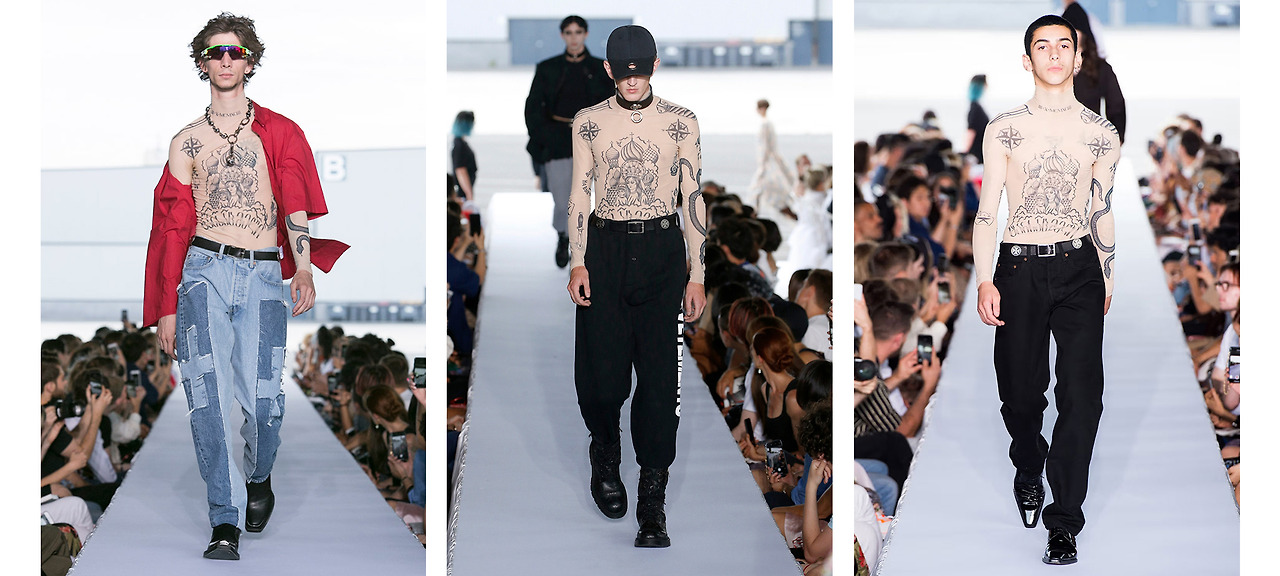 VETEMENTS의 10번째 컬렉션인 2019 SS 컬렉션을 두고 뎀나는 말했다. “나는 이 컬렉션을 우리가 살았던 곳에서 일어난 조지아 전쟁에 바쳤다.” 컬렉션이 시작되고 첫 캣워크를 장식한 건 다름 아닌 타투 스킨탑. 이 제품은 도입부로 언급했던 Maison Martin Margiela의 트롱프뢰유 타투 티셔츠에서 영감을 받았다는 사실을 눈치 빠른 당신이라면 이미 인지했을 수도.