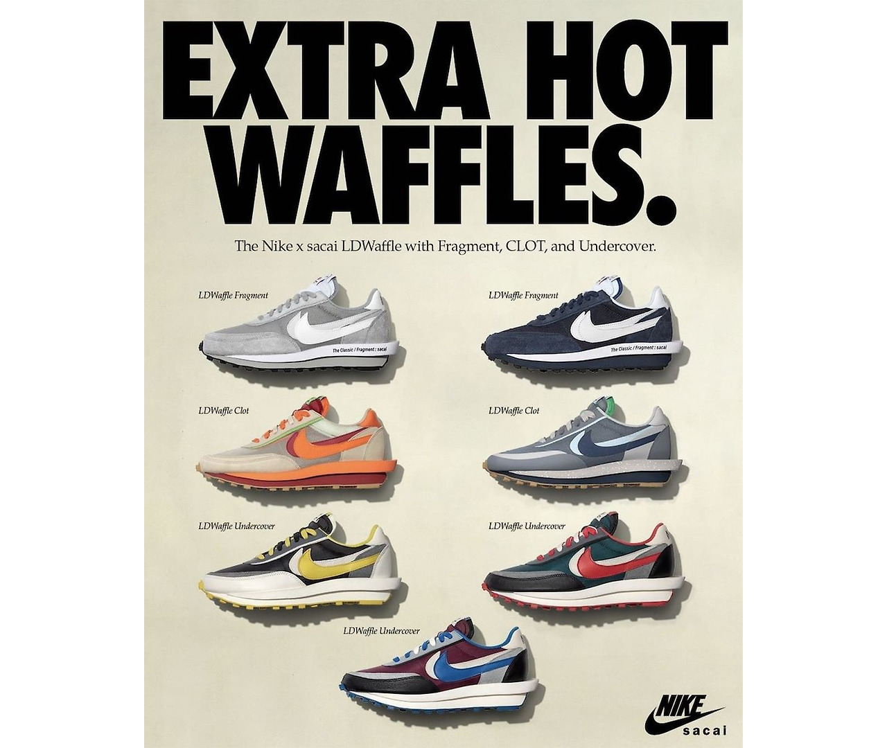 Sacai x Nike LDWaffle 시리즈는 FRAGMENT, UNDERCOVER, CLOT과 함께 협업해 7가지의 스니커즈를 선보였다. 브랜드 별 개성이 두드러지는 컬러블록과 프리미엄 스웨이드와 메쉬소재의 활용, 미드솔에 브랜드 레터링이 특징적이다.