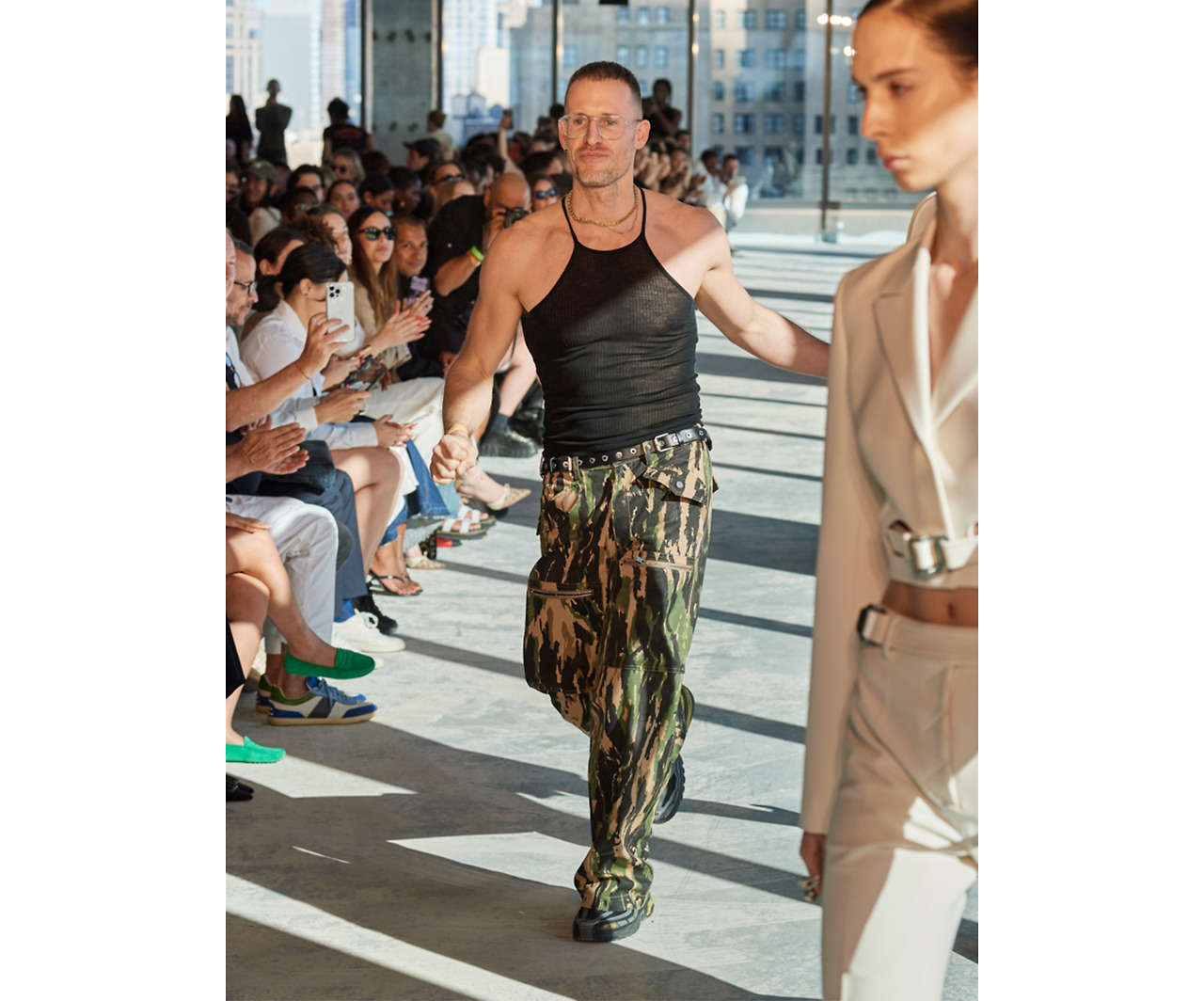 카모플라주 카고 팬츠를 통해 디온 리의 자연을 향한 집착을 엿볼 수 있다. 한껏 올라가 있는 입꼬리를 내보이며 당당한 발걸음으로 런웨이를 활보하는 디온 리. 그의 표정을 통해서 얼마나 만족스러웠던 쇼였는지를 다시 한번 확인해 볼 수 있다.