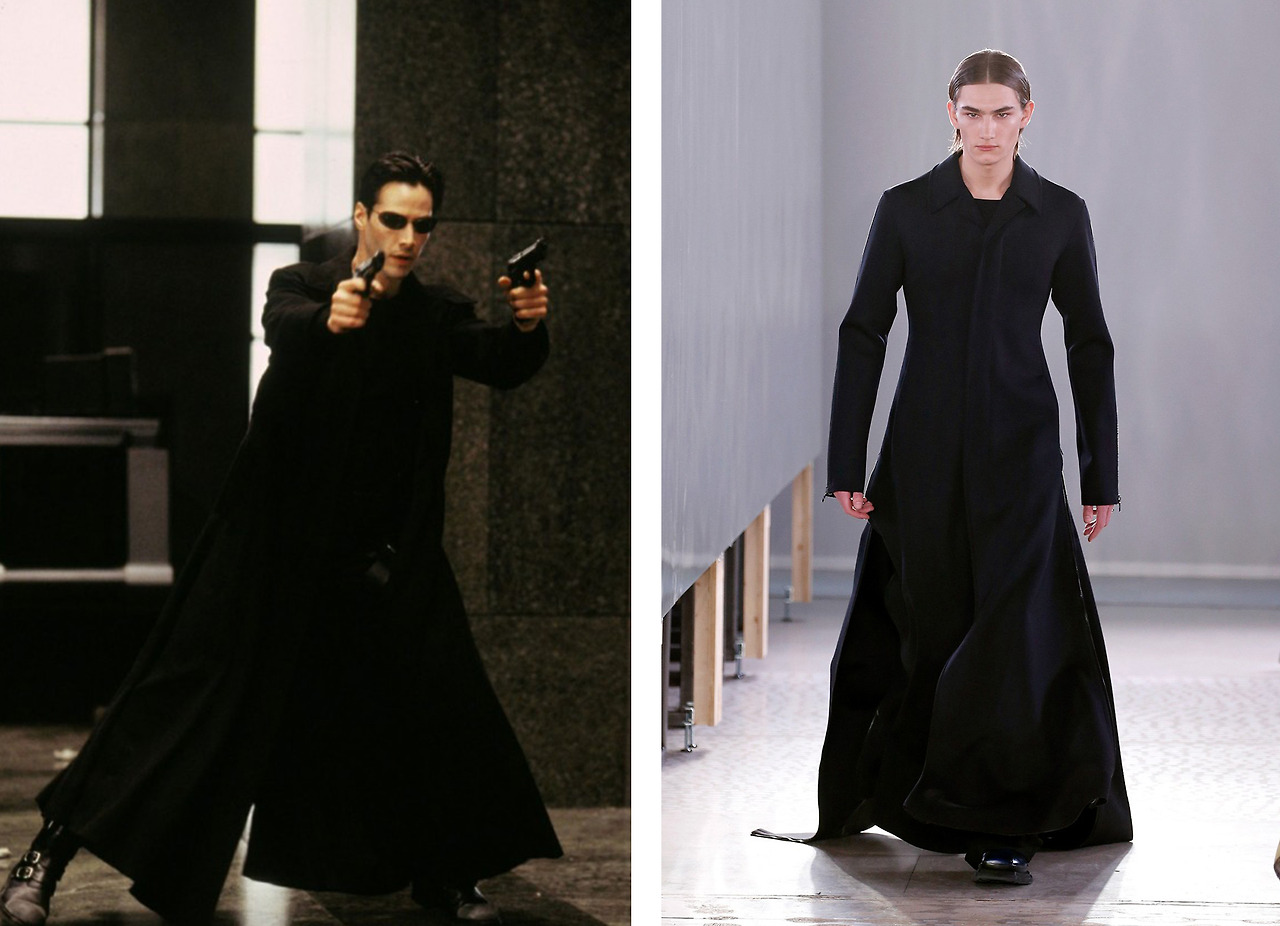 1999년에 개봉한 매트릭스는 블레이드 러너와 함께 사이버펑크를 대표하는 영화 중 하나로 평가되며, 영화에서 표현된 패션 스타일은 사이버펑크 패션의 교과서가 되었다. 극 중 여주인공인 트리니티가 입고 있는 광택감이 돋보이는 소재의 바디수트, 그리고 남주인공 ’네오’가 입고 있는 맥시한 기장의 코트와 이들이 공통적으로 쓰고 있는 슬림한 쉐입의 선글라스는 이들의 액션신을 돋보이게 하였으며, 반대로 화려한 액션신 덕분에 이 아이템들이 더욱 빛나 보인다.