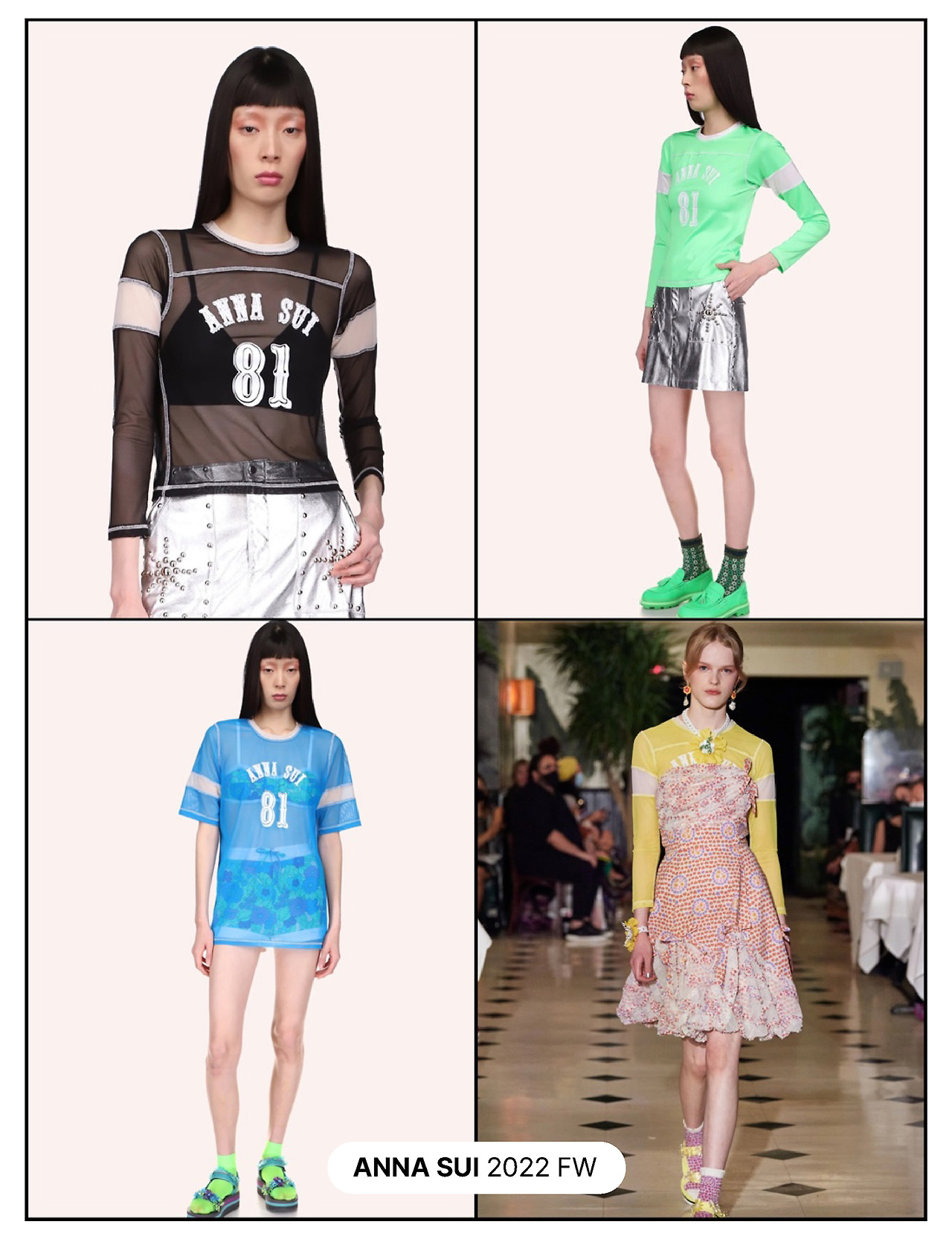 세상에는 참 많은 축구 유니폼이 있지만. 보통은 땀 흡수력을 위해 재생 폴리에스테르가 함유된 것이 대부분이다. 그래서 2020 SS, 안나수이에서 출시한 시어한 풋볼 유니폼은 남녀불문 모두의 마음을 사로잡기에 충분했으니. 속이 비치는 메쉬소재는 톡 튀는 이너웨어와도, 캐주얼한 청바지와도, 혹은 키치하고 컬러풀한 액세서리와도 여과 없이 잘 어우러질 터. 나는 겨울이 되면 비비드한 목폴라, 그리고 숏패딩과 한번 입어보고 싶다.