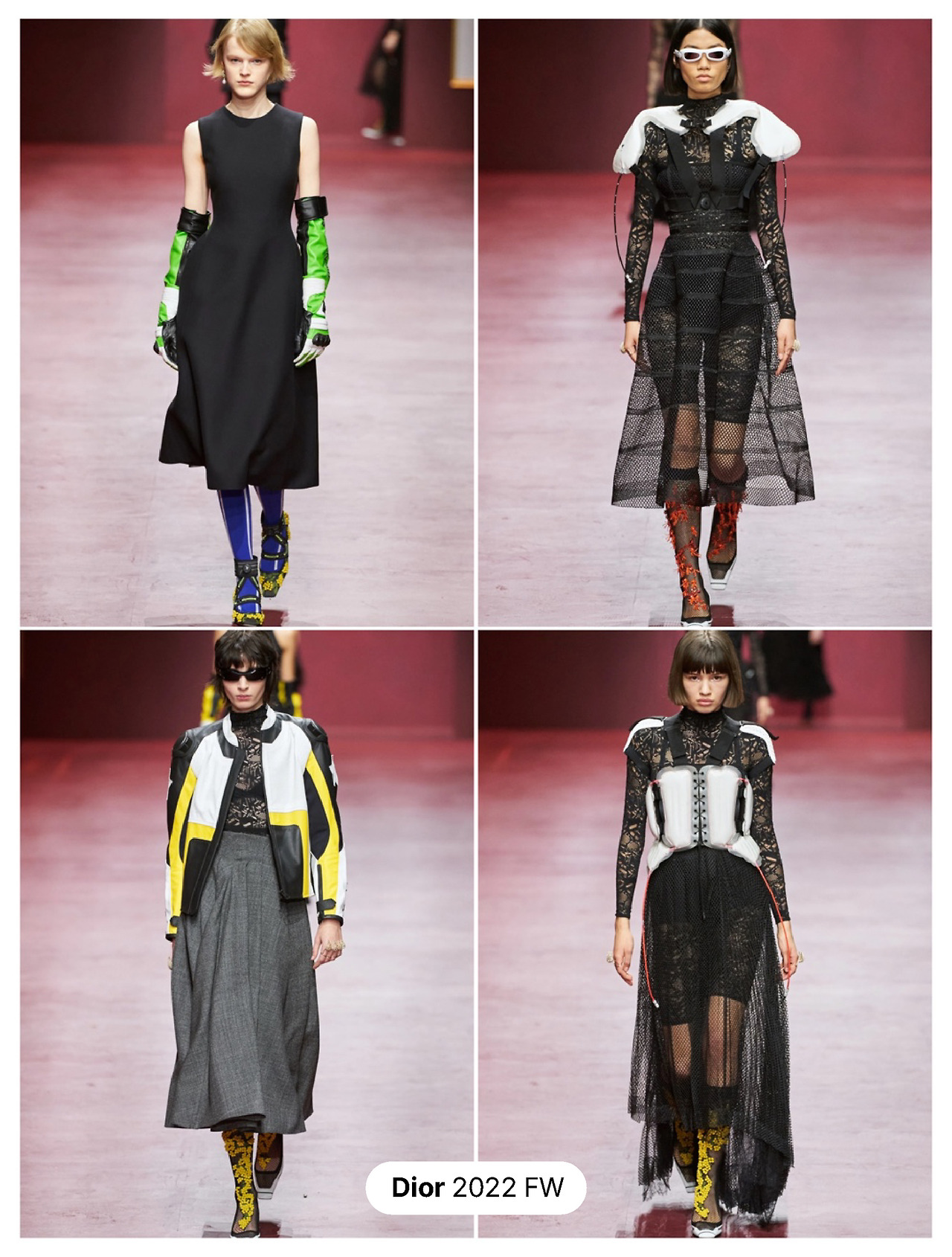 우아한 선과 형태를 위하여 지금까지도 코르셋을 고집하는 이지Dior만, 올해 FW시즌에는 조금 색다른 매력을 드러냈다. 기술의 진보에 따른 시대 변화에 앞서 다음 세대를 위한 새로운 형태의 '뉴룩'에 도전했다. Dior을 이끄는 크리에이티브 디렉터 마리아 그라치아 치루이 (Maria Grazia Chiuri)는 컬렉션 발표 이전에 러시아의 우크라이나 침공에 대하여 입을 열었다. "그런 침공 이전에도 우리는 코로나19라는 또 다른 전쟁을 겪었다. 그래서 어려운 시기에 아름다움과 미학을 포함한 보호용 패션을 탐구했다." 은 Dior몸이 좀더 편안할 수 있는, 기능적이고 스포티한 디테일을 가미했다. 풋볼 어깨 패드, 에어백 코르셋, 바이커 재킷, 그리고 레이싱 글로브 등.