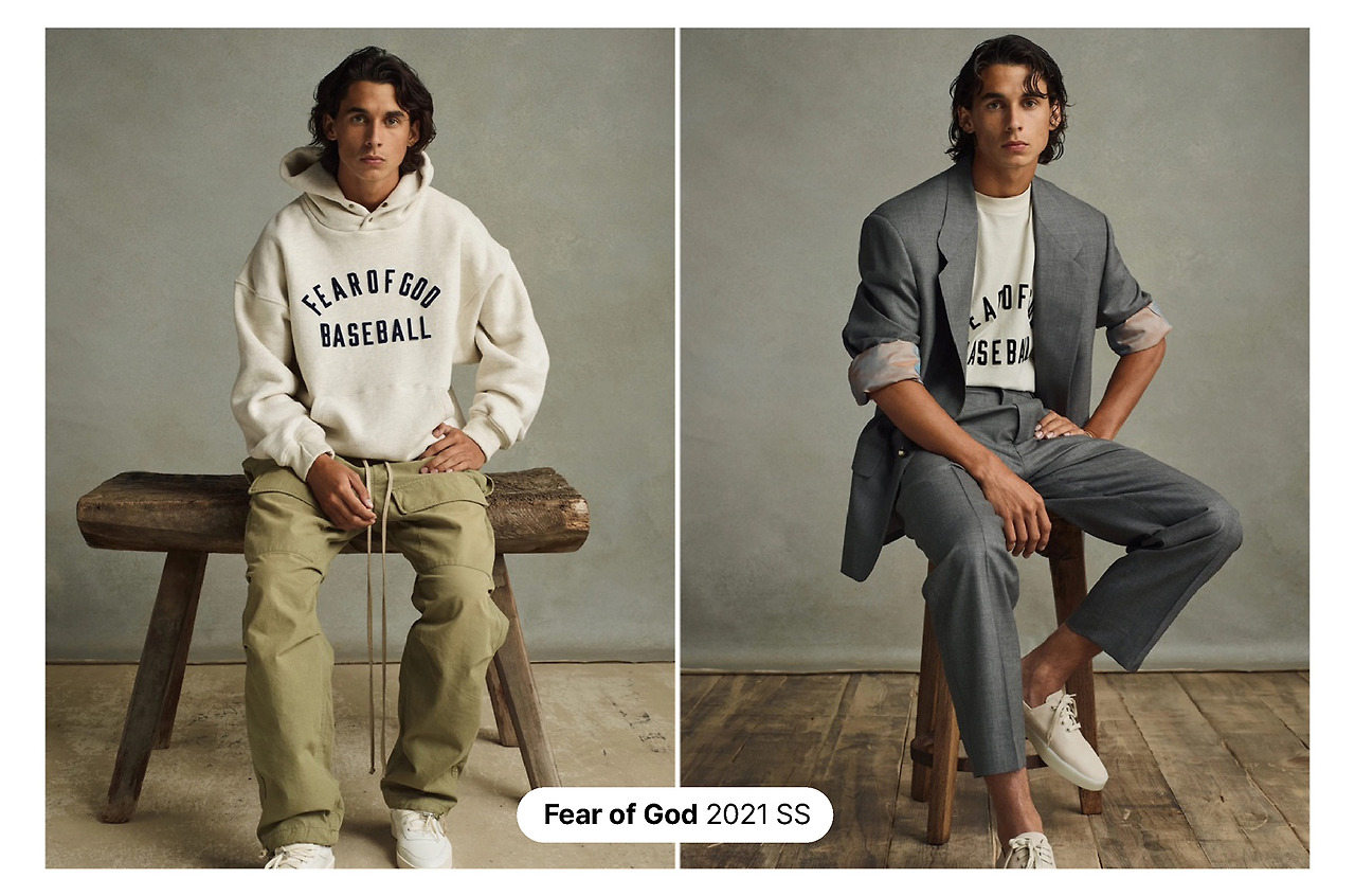 '시크한 그런지 룩'으로 국내에서는 지드래곤, 박재범, 로꼬, 쌈디 등 뮤지션들로부터 많은 사랑을 받았다. 작년의 Fear of God은, 심플한 무드에 스포티한 감성을 한 방울 떨어뜨린 모습을 보여줬다. 'BASEBALL'이라고 적힌 스웻셔츠에 포멀한 재킷이나, 카고 팬츠를 입힌 스타일링에 주목해 보길. 언뜻 보면 무난하고 미니멀한 룩이지만, 레터링 하나만으로도 쿨해져 버리는 마법.