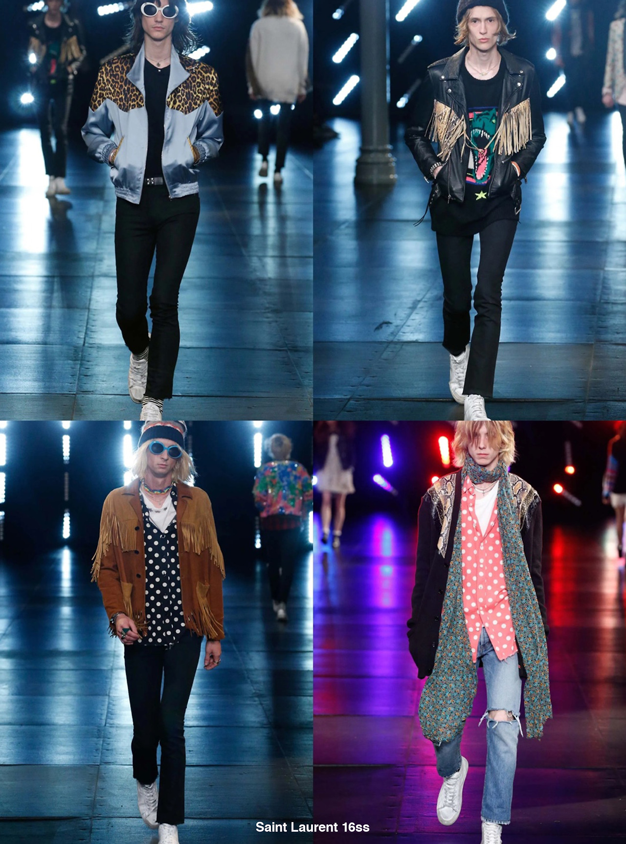 각각의 옷에선 빈티지함이 뚝뚝 흘렀다. 패치워크가 돋보이는 모터사이클 재킷, 낡은 체크 셔츠, 몇 년은 족히 입은 듯한 청바지, 꽃무늬를 수놓은 오버사이즈 카디건, 야자수가 그려진 새틴 점퍼 등, 에디 슬리먼의 멋대로 재해석한 커트 코베인의 패션이다. 여기다 커트 코베인의 길고 축 늘어진 머리 스타일까지 더하면, 끝.