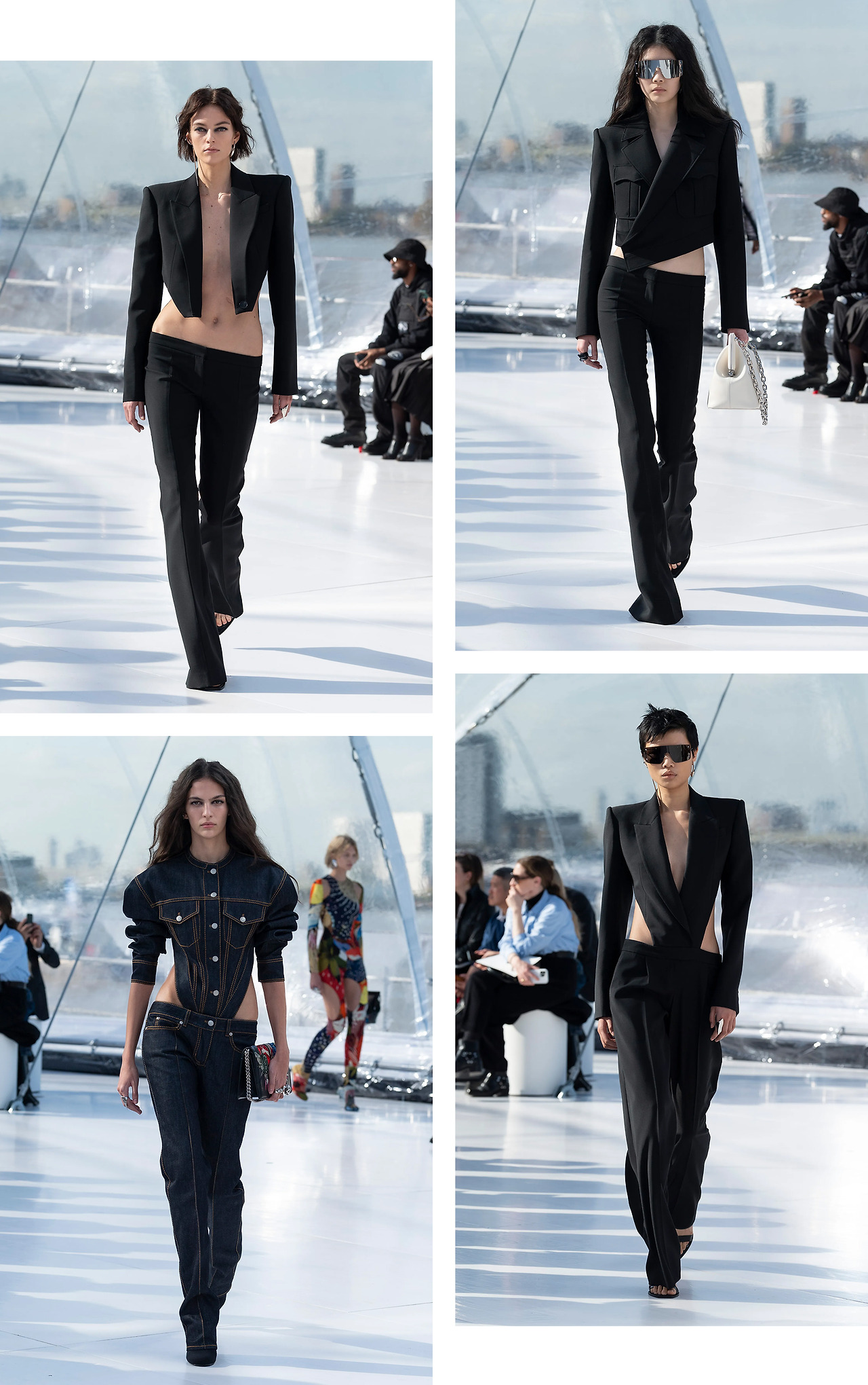 컬렉션이 풍부한 컬러로 로우라이즈 팬츠를 물들이고 있던 시점, Alexander McQueen은 흠잡을 데 없는 날렵한 실루엣의 테일러링과 ‘이 구역의 가장 시크한 스타일은 바로 나’ 라고 속삭이는 듯 올 블랙룩을 선보인 것. 로우 라이즈의 오리지널 브랜드 답게 금방이라도 흘러내릴 것 같은 극단적인 밑위 기장의 팬츠로 가장 주목할 만한 모티프를 제공했다.