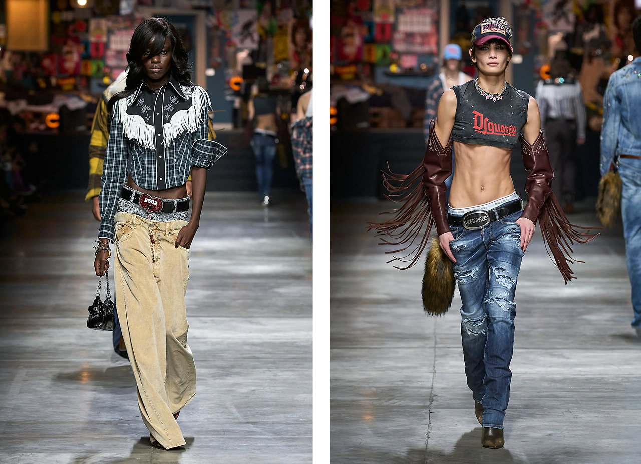 Y2K 하면 가장 먼저 떠오르는 추억의 브랜드 Dsquared2 또한 로우라이즈행 열차에 탑승했다. 쌍둥이 듀오 디자이너 딘(Dean)과 댄 카튼(Dan Caten)은 맥시멀리스트 스타일에 로우라이즈를 더해 과감하고 개방적인 컬렉션을 펼쳐냈다. 골반을 가감 없이 드러내는 로우라이즈가 트렌드로 등극하며 언더웨어가 함께 주목받게 되었는데 그 요소를 컬렉션에 고스란히 담아낸 Dsquared2.