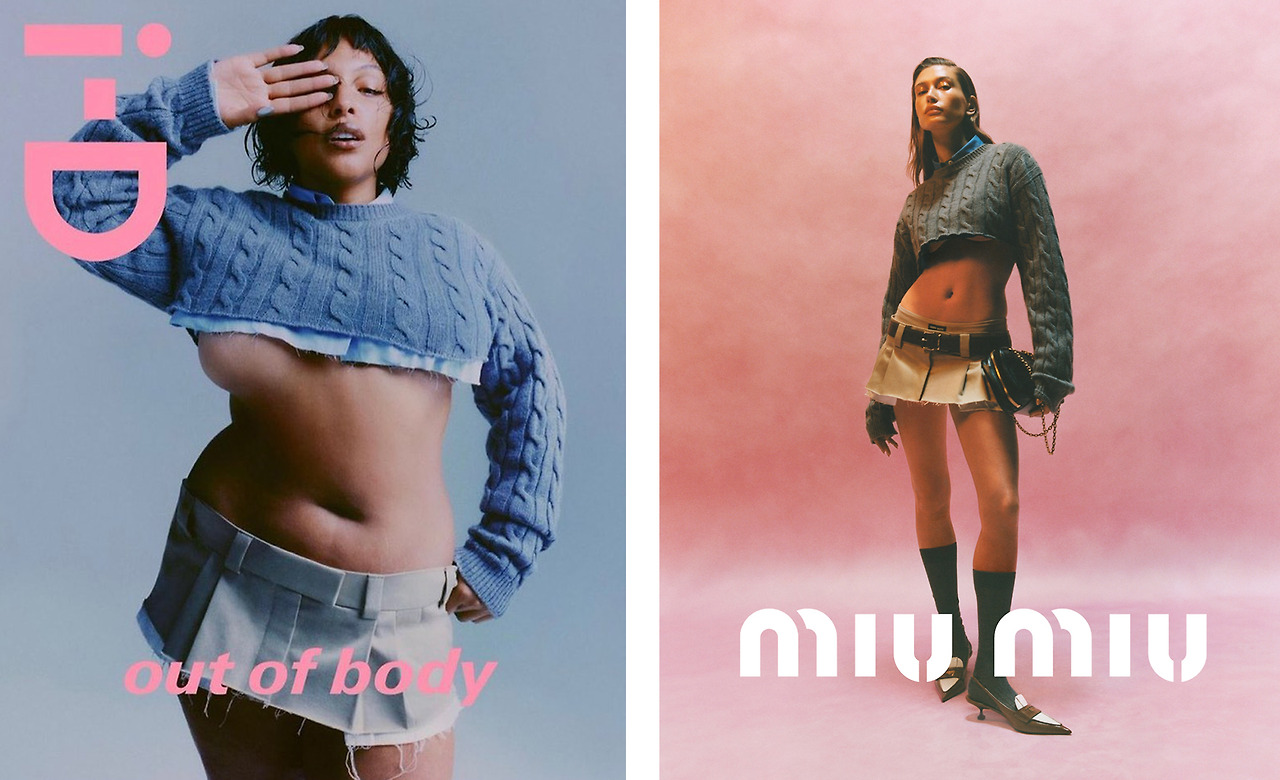 정형화된 사이즈 기준을 벗어난 플러스 사이즈 모델, 팔로마 엘세서(Paloma Elsesser)는 MIU MIU 컷 아웃 크롭 탑, 로우라이즈 스커트를 착용해 i-D 커버를 장식했다.