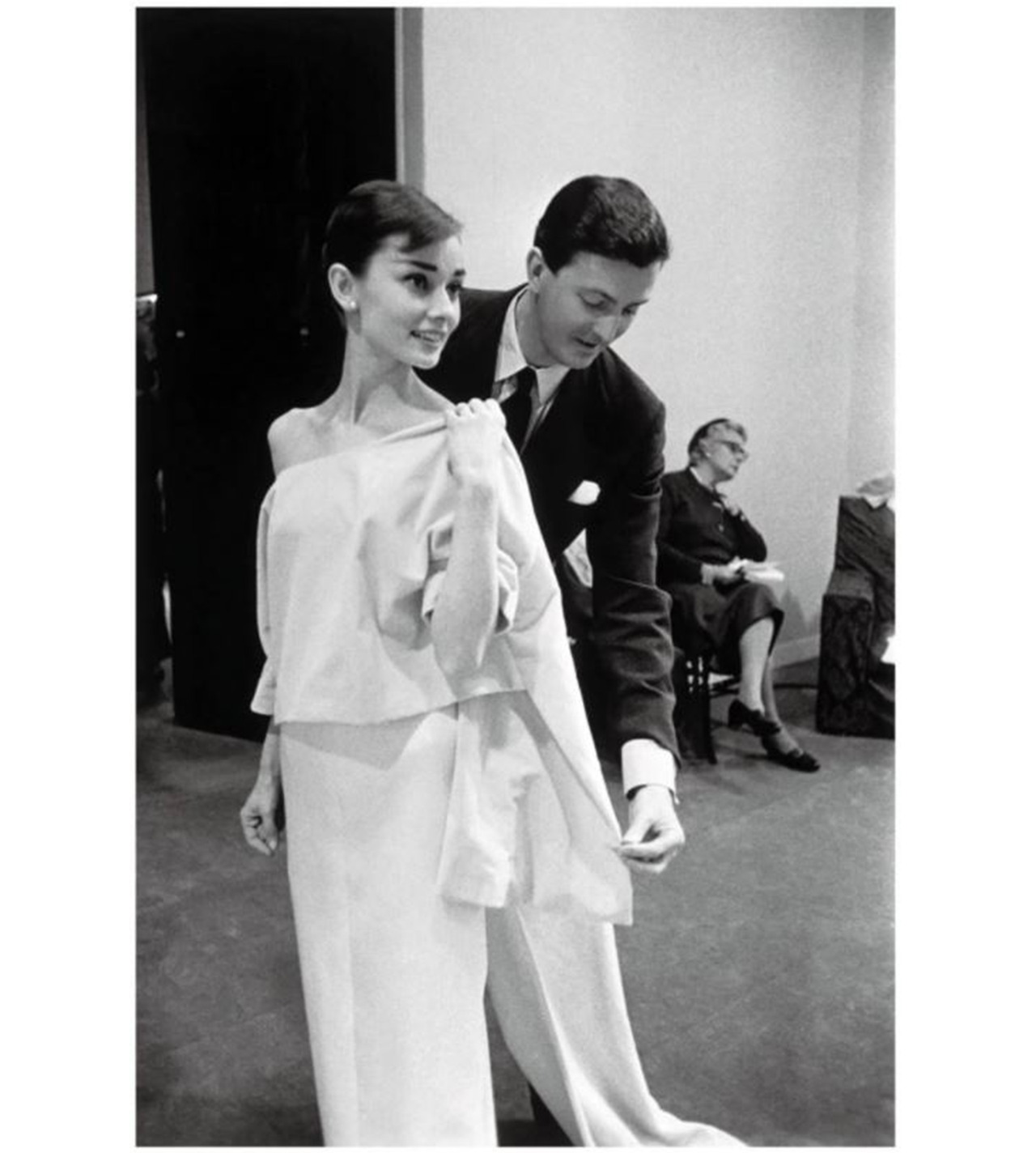 오드리 헵번은 지방시 살롱에 방문해 맞춤복을 주문하지만 지방시는 오드리 헵번이 누구인지도 몰랐고, 다음 컬렉션 준비로 바빴기 때문에 주문을 거절한다. 후일담으로는 지방시가 오드리 헵번을 당시 유명 배우 캐서린 헵번(Katharine Hepburn)으로 착각하고 오드리 헵번이 온 것을 보고는 실망했다는 이야기도 있다. 그러나 오드리 헵번은 앞으로 있을 운명을 직감이라도 한 것인지, 물러서지 않고 지난 시즌의 드레스라도 보여주기를 요구한다. 지방시는 오드리 헵번에게 기성복을 보여줬고, 그 중 하나를 오드리 헵번이 고르는데…