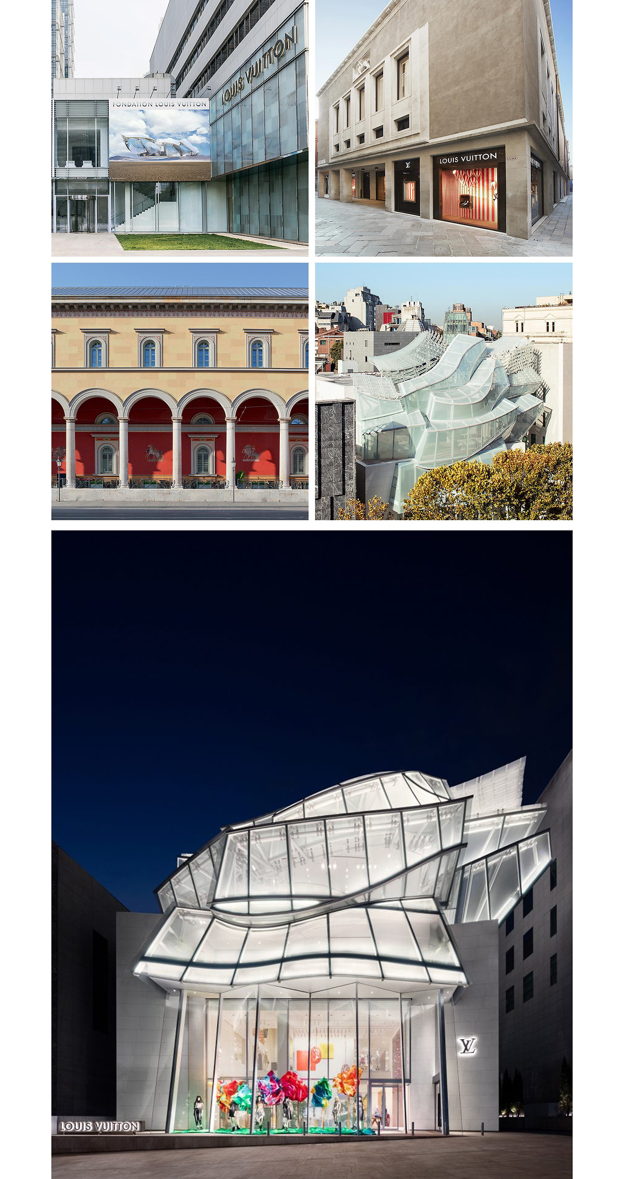 Fondation Louis Vuitton을 비롯해 동시대의 작품을 선보일 수 있는 전시장으로서 역할을 하는 Espace Louis Vuitton은 도쿄, 뮌헨, 베네치아, 베이징, 오사카에 자리한다. 국내에는 청담의 Maison Louis Vuitton Seoul에서도 찾아볼 수 있다.