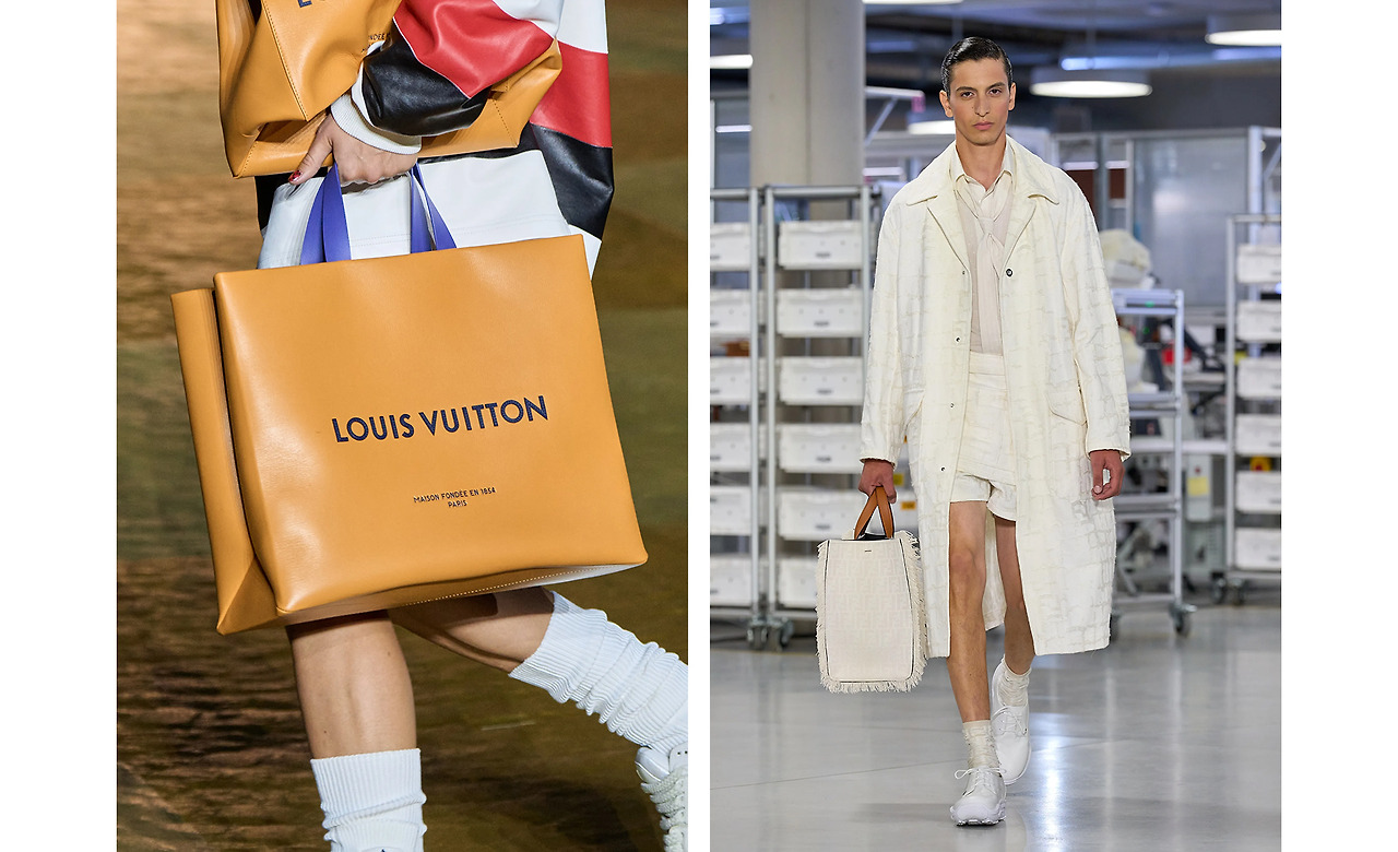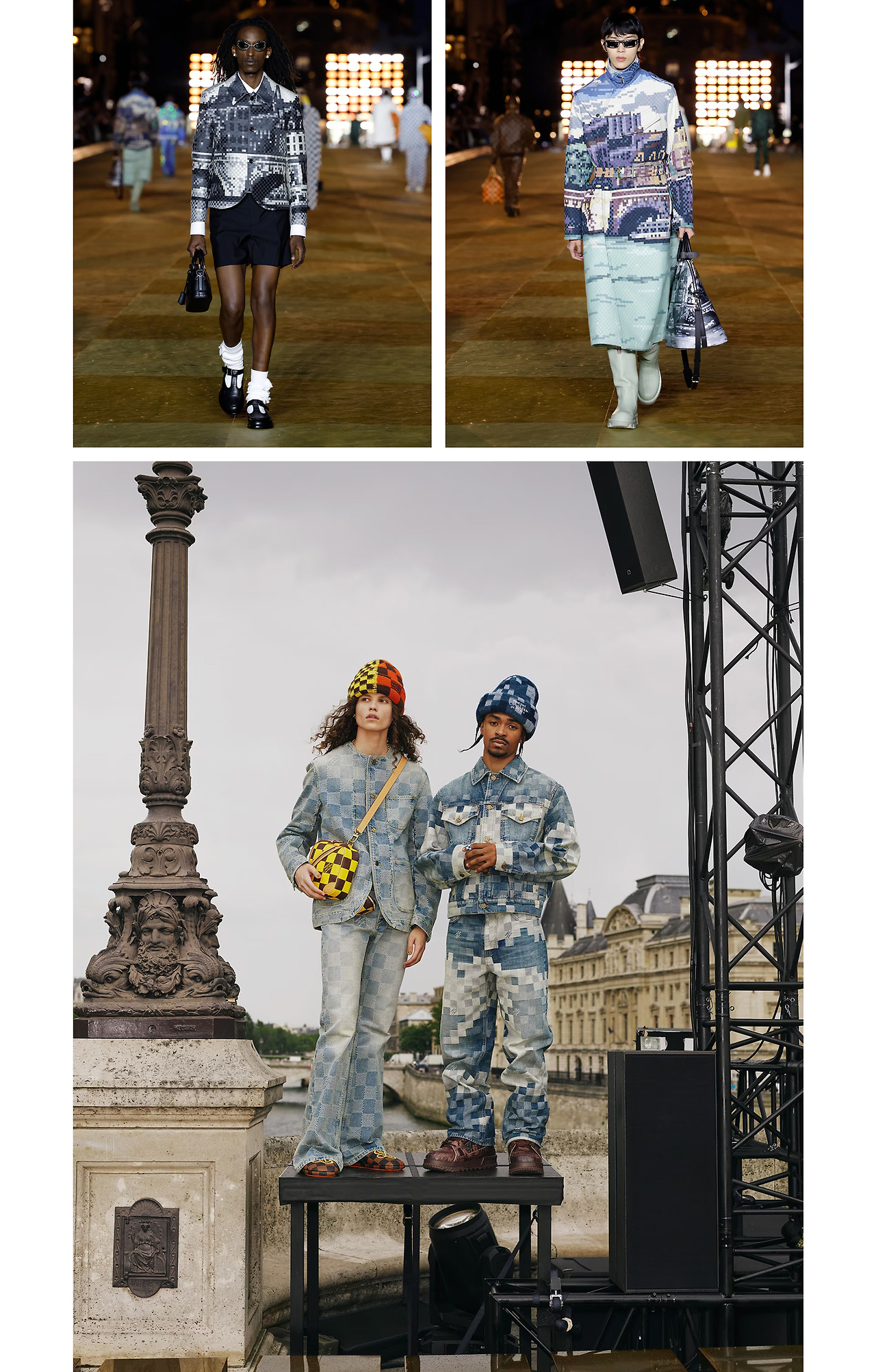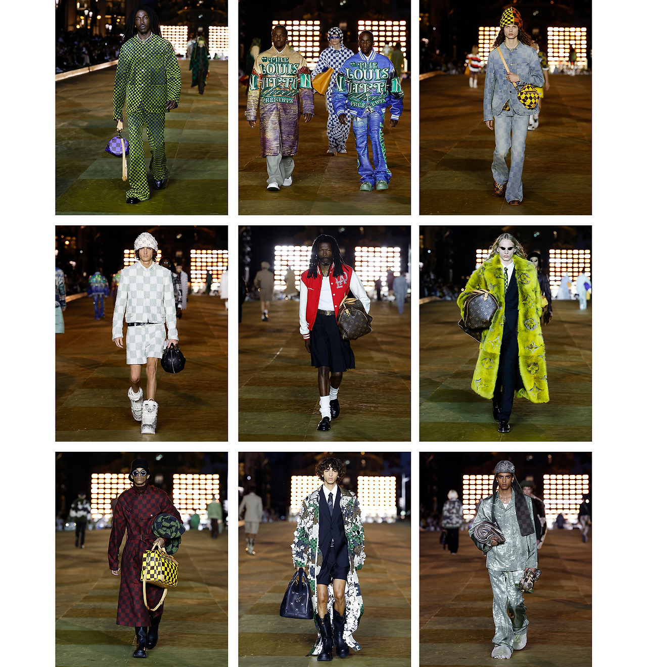 Louis Vuitton의 시그니처 에피 가죽(Epi Leather)과 1934년 처음 선보인 다미에 체커보드 패턴과 카모플라주의 융합 ‘다모플라주(Damoflage)’를 필살기로 내세웠다. 다모플라주는 대담한 색상과 함께 워크웨어 재킷, 브레스티드 코트, 팬츠, 모자, 트래블 러기지백, 넥타이에 겹겹이 쌓였다.