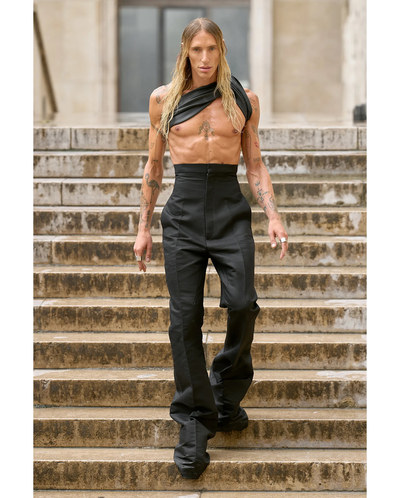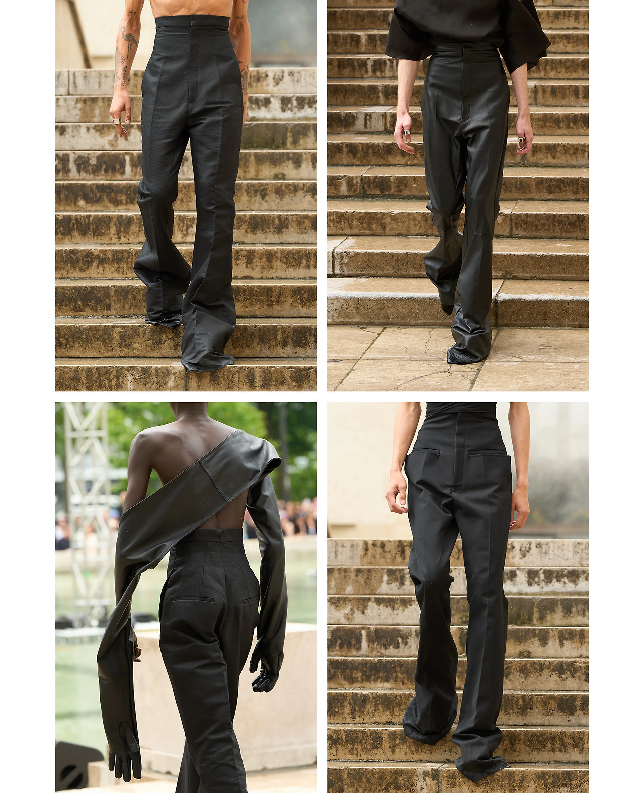 LOEWE 하이라이즈 데님을 쉽게 소화할 수 있을 것 같았다면 다음 단계로 뛰어넘어 보자. 카리스마를 마구 뿜어내며 존재감을 드러낸 Rick Owens 하이웨이스트 팬츠는 컬렉션을 이끈 주역이라고 할 수 있겠다. ‘자, 보이지? 여기서부터 여기까지가 내 다리야.’라고 주문을 외는 듯 압도적인 웨이스트와 질질 끌리는 바지 기장을 잠시 감상해 보시라.