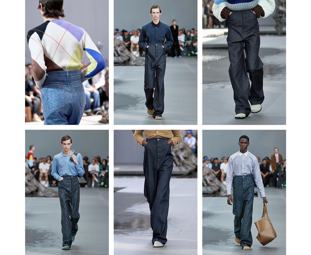 우월한 기럭지를 소유한 모델들이 입어서일까. 주머니에 손을 넣고 걷는 모델의 워킹을 보고 있노라니 이유 모를 안정감이 느껴진다. 지금 당장이라도 밑으로 툭 내려가 버릴 것 같았던 아슬아슬한 로우 라이즈보다는 진입장벽이 낮은 건 사실이나 명치에 닿을 듯 말 듯한 하이 라이즈도 마냥 쉬워 보이진 않는다.