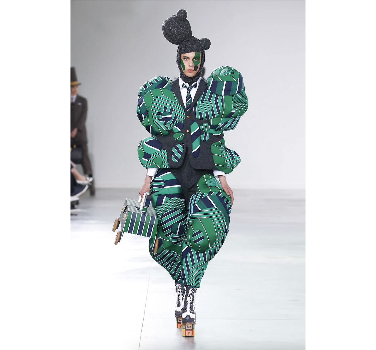 네이비와 그린 스트라이프 원단들이 복잡해 보이지만 재밌게 패치워크 되어 있고, 볼륨을 넣어 여러 군데 볼드하게 부풀어 있는 실루엣이 포인트인 룩이다. 울 수트 셋업을 이렇게 맥시멀 하게 표현할 수 있는 게 톰 브라운의 필살기 아닐까. 룩의 패턴을 그대로 형상화한 박스 토트백도 인상적이다.