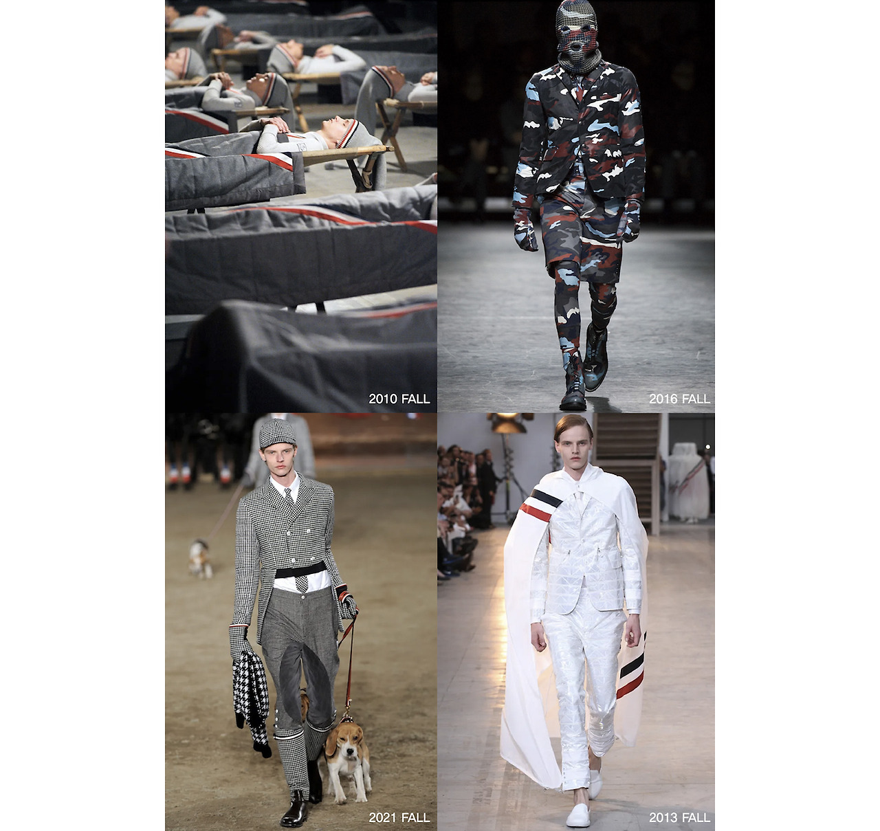 개인적으로 가장 좋아하는 톰 브라운의 쇼는, 그가 디렉터로 있던 '몽클레르 감마블루' 라인의 2011 FW 쇼 였다. 모델들이 귀여운 강아지들을 데리고 나와서 기억에 남는다. 경마장을 가득하게 메우는 트럼펫의 소리에, 승마 코트를 입은 다섯 명의 기병들이 강아지들과 함께 워킹을 보여준 강렬한 쇼였다. 역시 톰 브라운에게 패션쇼는, 그의 상상해온 판타지를 구현하는 기회이자 공간이다. 진보의 탈을 쓴 보수적인 패션계에서 어느 것에도 속하지 않고 자신만의 것을 관철해 나간다는 평을 받고 있는 이유다.