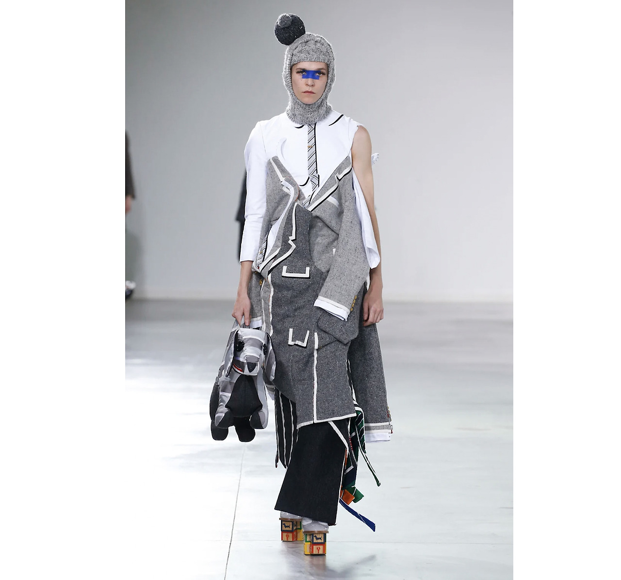 처음부터 재미있다. 혹이 난 듯 둥근 니트볼을 부착한 볼드한 바라클라바와 블루 페이스페인팅. 여러 옷들을 겹겹이 레이어드 한 것처럼 보이지만, 사실 원피스인 것이 반전. 전반적 컬러감을 그레이 톤 그라데이션으로 표현하고, 여러 옷들이 겹쳐 보이게끔 착시 효과를 부여했다. 나의 소장 욕구를 자극했던 유명한 도그 셰이프 토트백도 눈에 띈다. 자세히 보면 신발의 미드솔의 도그 프린팅도 발견할 수 있을 거다.