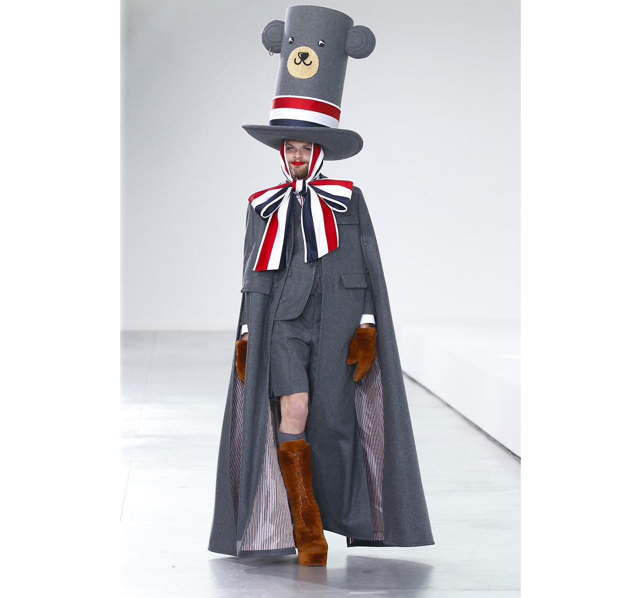 톰브라운 시그니처 삼선 스트라이프 리본으로 바라클라바처럼 스타일링하고, 쇼츠 수트 셋업에 맥시한 케이프 코트까지 같은 컬러로 레이어링한 전략. 매우 통일감있으면서도 다채로워 보인다. 케이프 코트의 안감 스트라이프가 살짝 보이는 것도, 톰 브라운만이 챙길 수 있는 꽤나 중요한 디테일이다.
