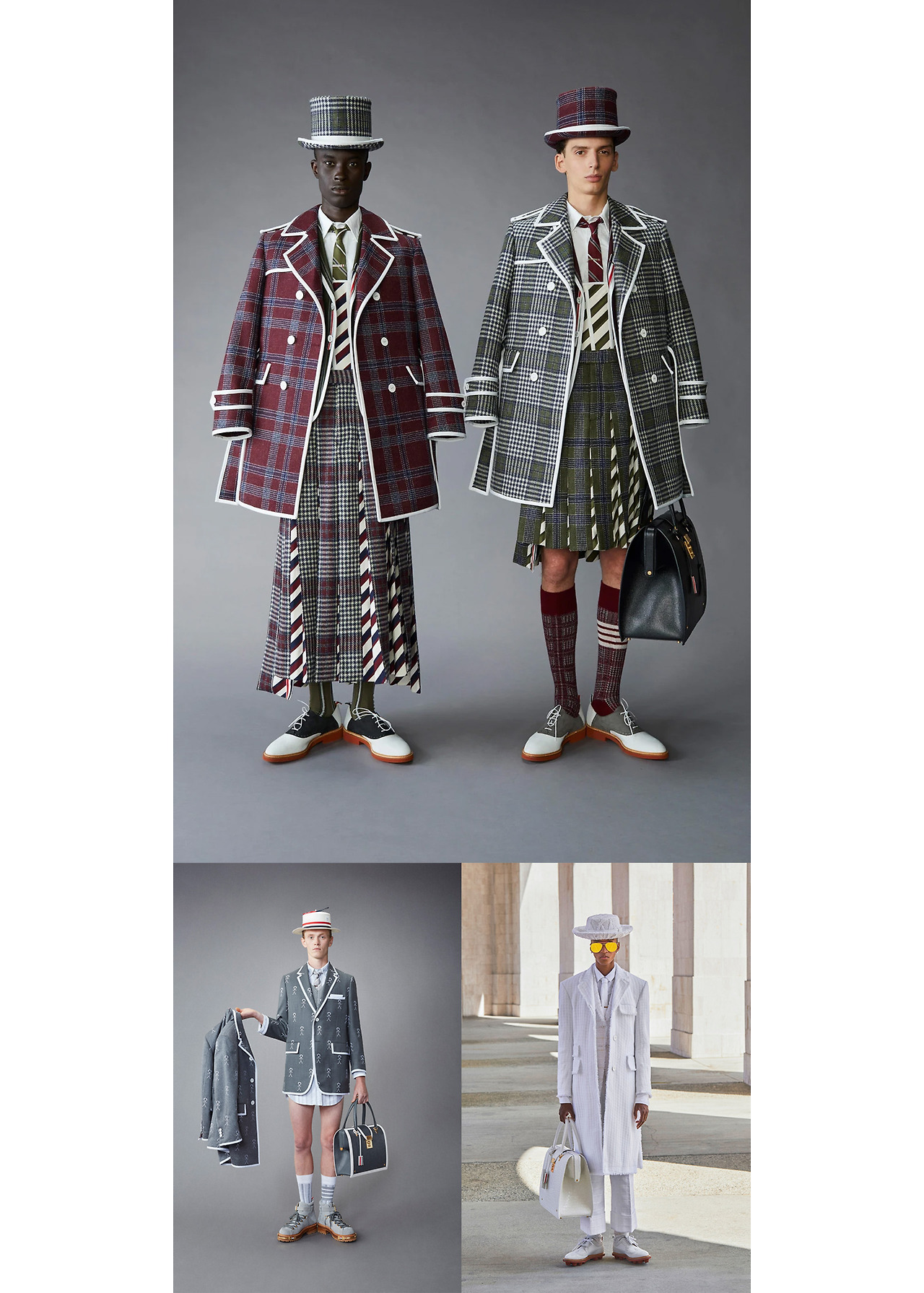톰 브라운의 아이콘인 그레이 슈트가 주제에 맞게 다채롭게 변형된 모습. 스트라이프 체크, 파이, 주름 디테일이 오묘하게 어우러지며, 스커트 아래 팬츠를 겹쳐 있는 레이어드 스킬이 특이나 돋보였던 시즌이었다. 스커트를 입은 남성 모델들은, 극단적으로 과장된 실루엣의 수트를 입고선 높은 플랫폼 부츠를 신고 걸어 나왔다. 쇼장에 앉아있던 모든 이들은 마치 놀이동산에 방문한 듯 반짝거리는 눈을 하고 지켜봤다고.