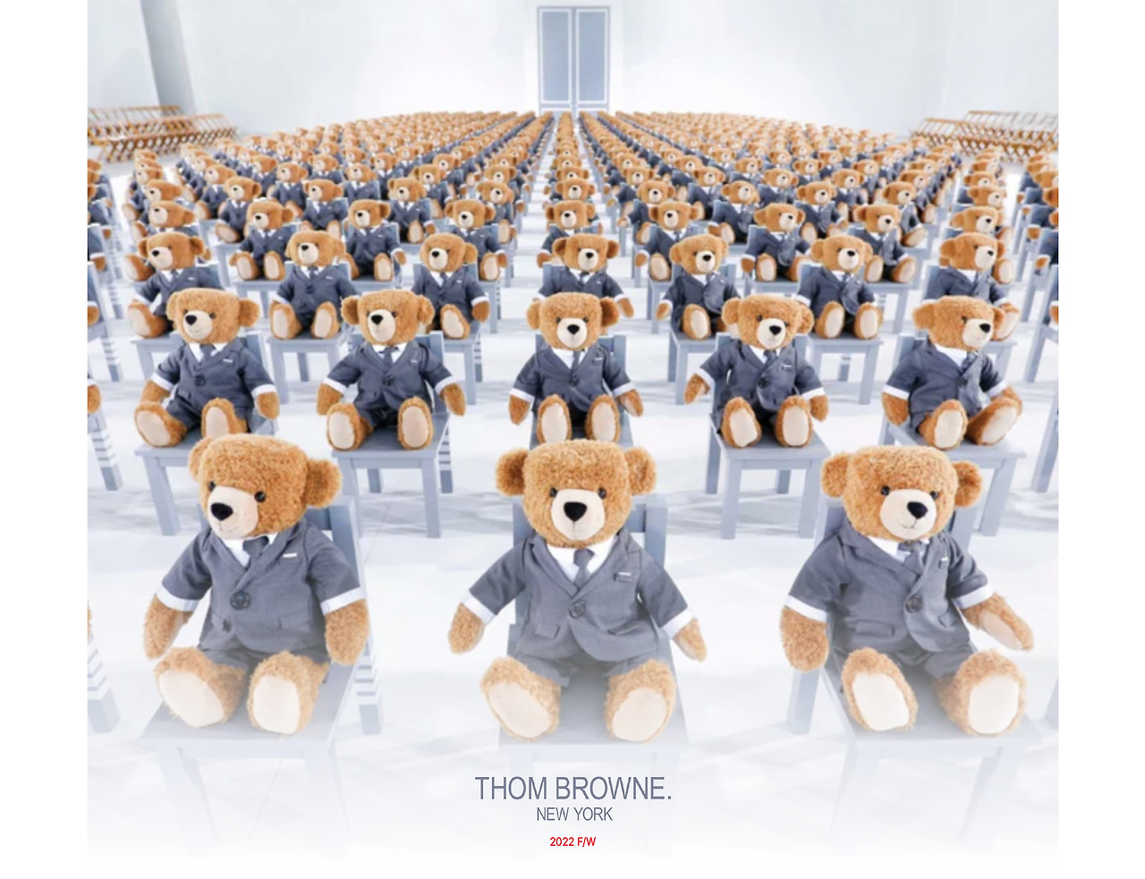 나지막한 내레이션과 함께 시작된 톰 브라운의 2022 FW 패션쇼. 그야말로 '성인과 어린이' 모두를 위한 한 편의 동화였다. 쇼장에는 브랜드의 시그니처인 '그레이 수트'를 입은 테디베어 500마리가 정연하게 나란히 앉아 있었으며, 인형과 테디베어로 분장한 모델들은 입가에는 장난스러운 미소를 머금은 채 차례로 등장했다.