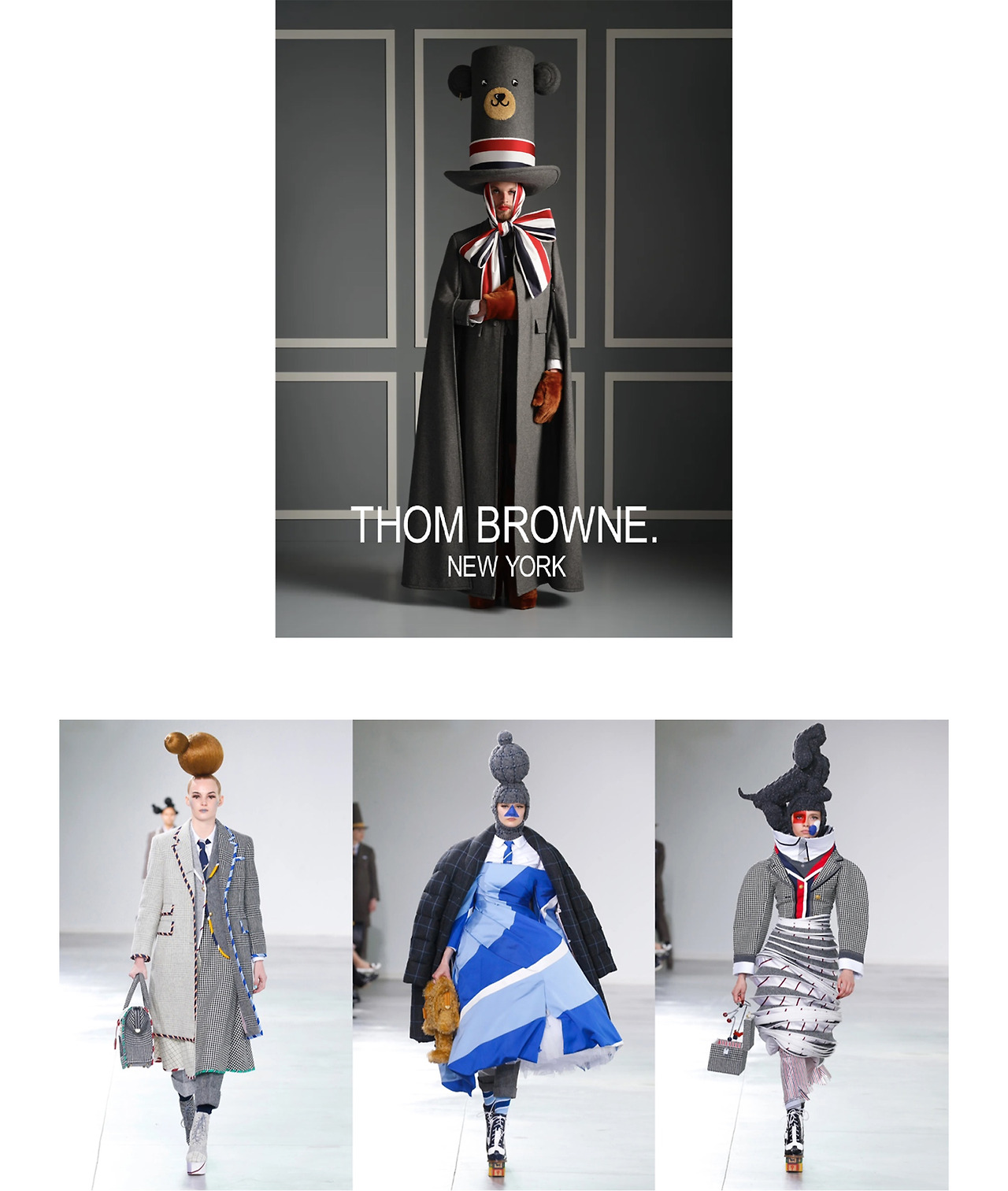 판타지 세계를 엿보는 듯하다. 톰 브라운의 쇼는 언제나 이상적이라고 유명하다. 그의 패션쇼가 현실의 옷장을 채우기 위한 것이 아니라, 오직 '자신의 아이디어를 세상과 공유하기 위한 것'이기 때문이다. 그래서 아이스링크, 호수 등 그 누구도 예상치 못한 곳에서 패션쇼를 진행한다. 그 안에서 모델들은 오븐에 구운 칠면조를 들고 나오고, 재밌는 가면을 쓰고 나오거나, 앵무새 탈을 쓴 모델이 쇼장을 헤집고 다닌다.