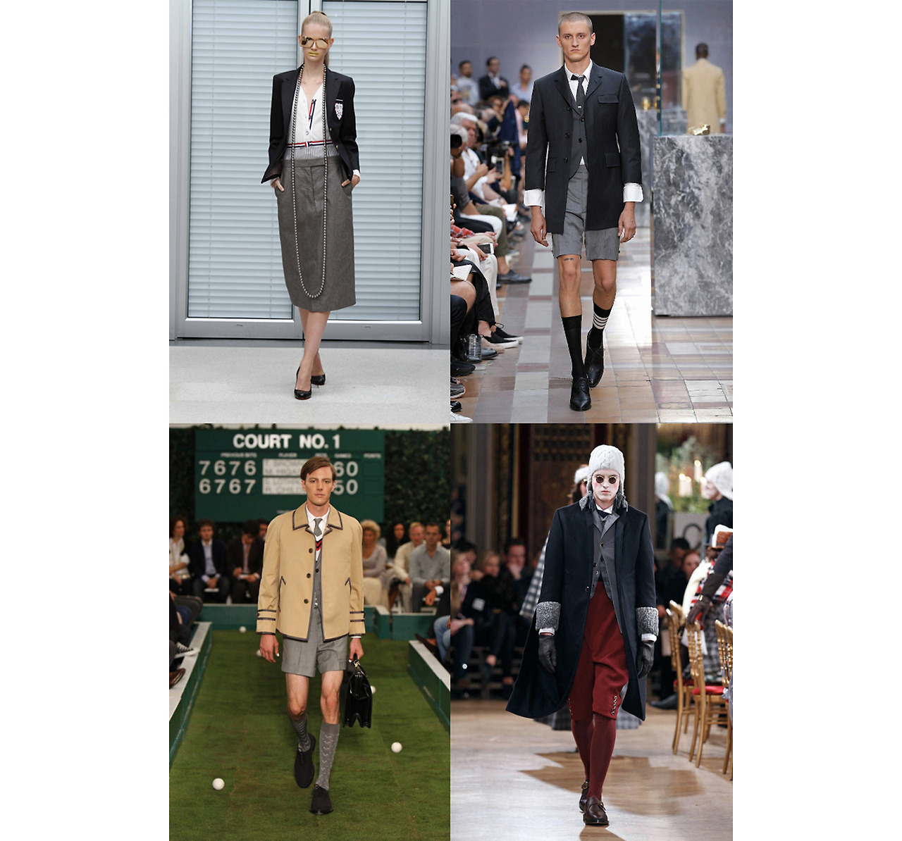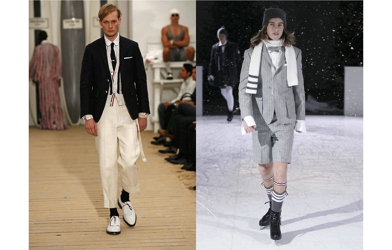 매일 회색 정장을 입고 출근하시던 아버지에게 영감을 받은 톰 브라운. 그가 만든 수트는 과거 '전통적인 미국 수트'의 정석과는 확연히 다른 모습을 가지고 있다. 1960년대부터 미국 디자이너들은 오직 '편안함'을 강조하기 위해 큰 어깨, 적은 수의 단추, 주름 없는 오버핏 정장을 공장처럼 찍어내고 있었는데. 2006년부터 톰 브라운이 선보인 수트는 그 어느 국가, 어느 도시에서도 볼 수 없었던 새로운 무드였다. 여전히 좁은 라펠, 주름이 없는 바지, 적당한 어깨 등 미국 수트의 전통성을 가지고 왔지만, 뭔가 다르다. 노턱 팬츠와 발목까지 오는 짧은 기장감, 엉덩이를 덮지 않는 자켓의 길이, 투 버튼 혹은 쓰리 버튼, 측면의 벨트, 바지에 끼워넣은 타이, 그리고 날씨가 덥다 싶으면 반바지 수트. 그야말로 톰 브라운만의 취향으로 수트를 재정의했다.