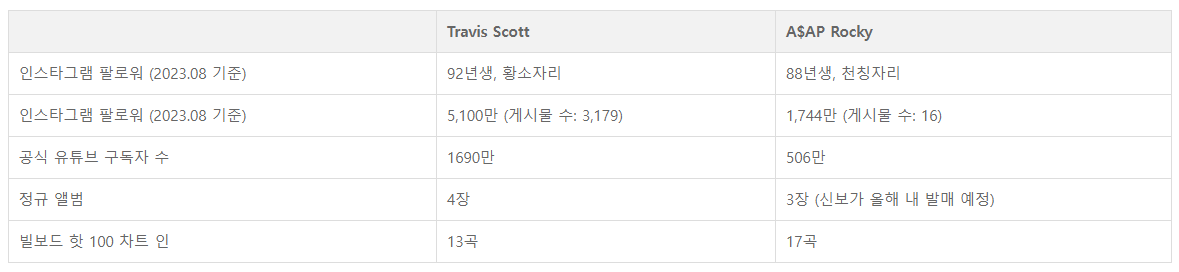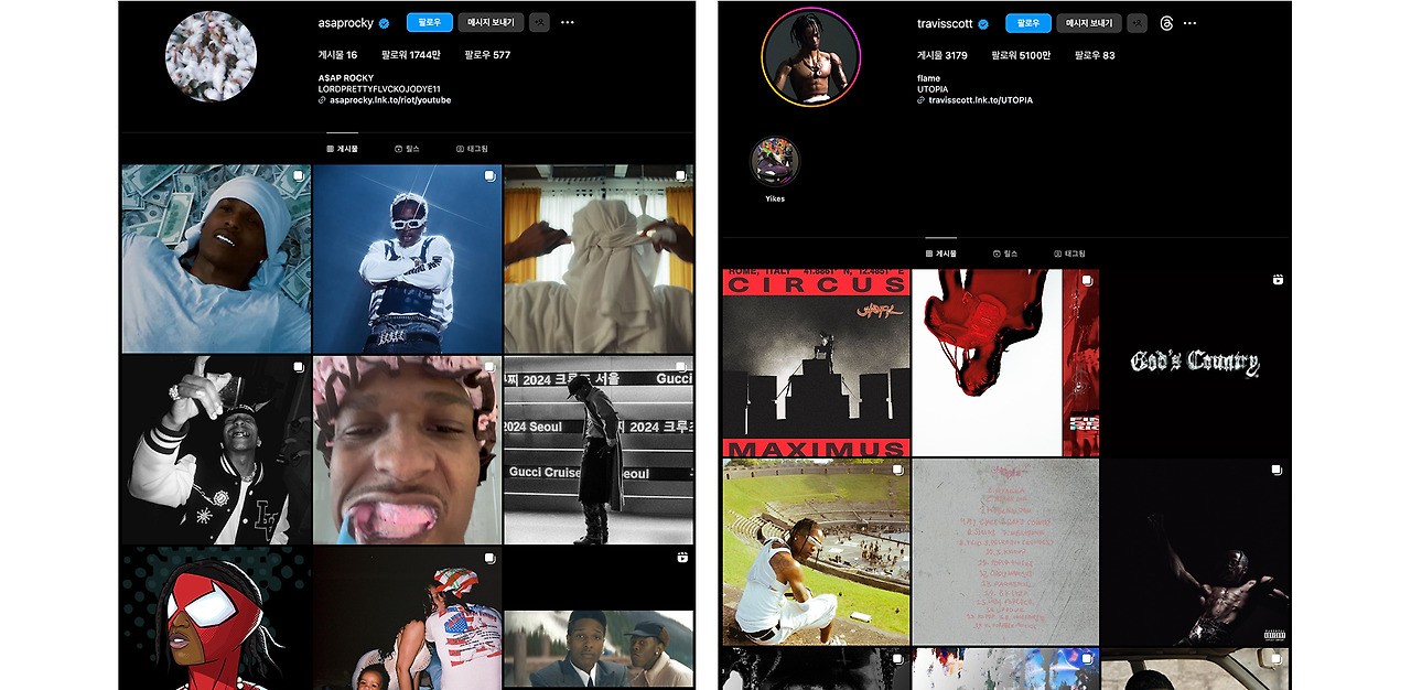 인스타그램 팔로워 수는 역시 트래비스의 압승이다. 하지만 개설된 날짜와 게시물의 수를 비교했을 때, 에이셉 쪽은 신생이나 다름없다는 걸 인지할 것. 하지만 공식 유튜브에선 거의 3배에 가까운 구독자의 차이를 보이기에 결국 인지도 면에선 트래비스의 손을 들어줄 수밖에 없을 듯하다.