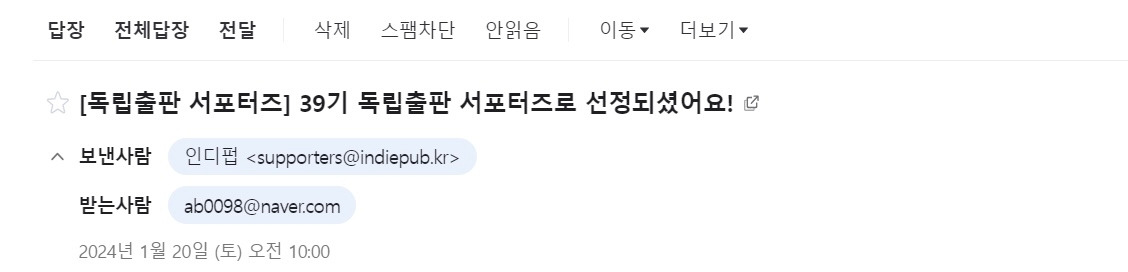 문학동네 완독 챌린지 독파의 앰배서더로 6개월 정도의 시간이 흐르고 작별을 고해야 하는 타이밍에 인디펍의 39기 서포터즈로 선정되었다. 인디펍은 독립출판물의 원활한 유통을 적극적으로 지지하는 독립출판 플랫폼이자 독립출판 온라인 서점이다. 서평 도서를 제공해준다 하여 보물찾기 같은 행복한 고민을 했다.