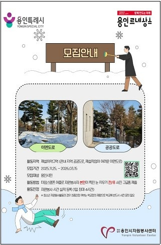 내가 사는 용인시에는 그 마음을 알아주는 제도가 있다. 바로 '용인시자원봉사센터'가 주관하는 ' 우리동네 눈치우기 봉사활동 인증'이다. 집 앞 공공도로와 제설 사각지대의 눈을 치우면, 이를 자원봉사 실적으로 인정해 주는 방식이다. 하루 최대 4시간까지 가능하고 절차도 단순하다. 단체 가입이나 번거로운 서류는 필요 없다. 활동 사진과 간단한 일지를 제출하면 된다.