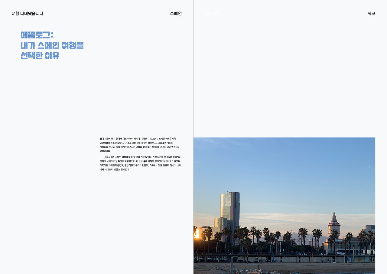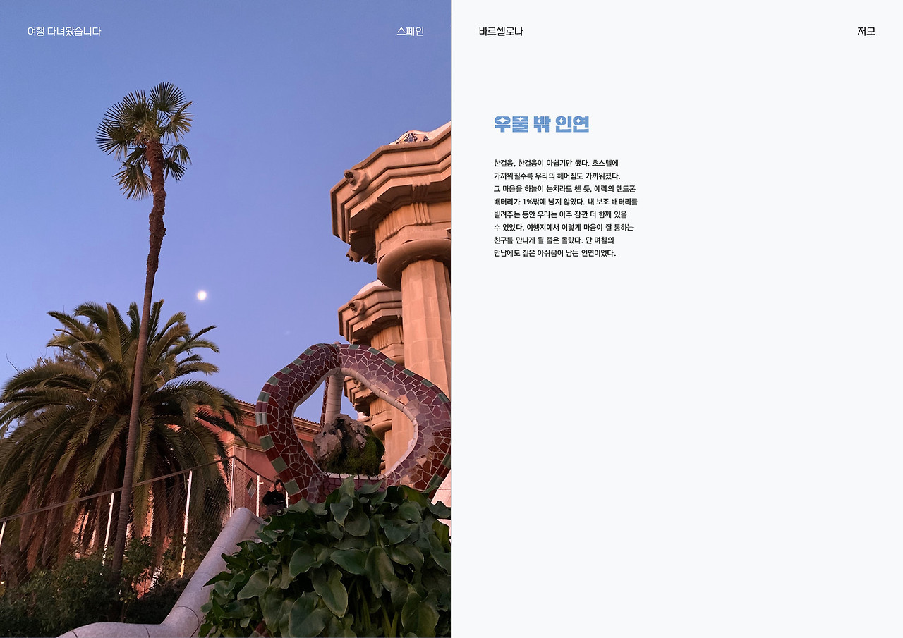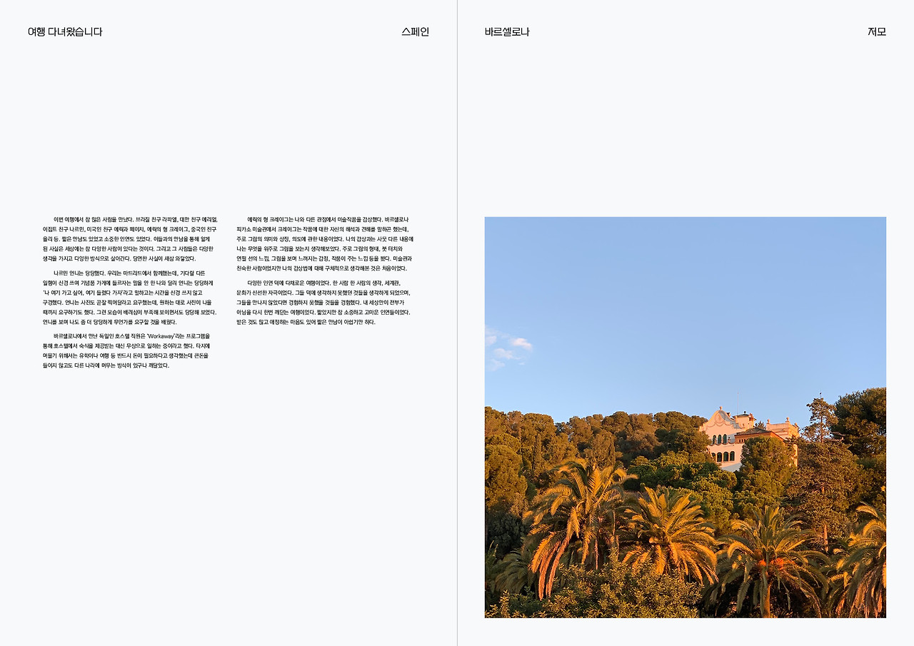 그래서일까 스페인 여행에 대해 할 말이 가장 많았다. 가장 최근에 한 해외여행이기도 하지만 나에게 가장 특별한 여행이었다. 이 글을 통해 여행을 정리하고 뒤돌아보고 싶었다. 이국적인 스페인의 풍경도, 환상적인 가우디의 건물도, 그곳에서 만난 인연도, 당시의 나도, 다시 꺼내 보니 반갑고 행복했다.