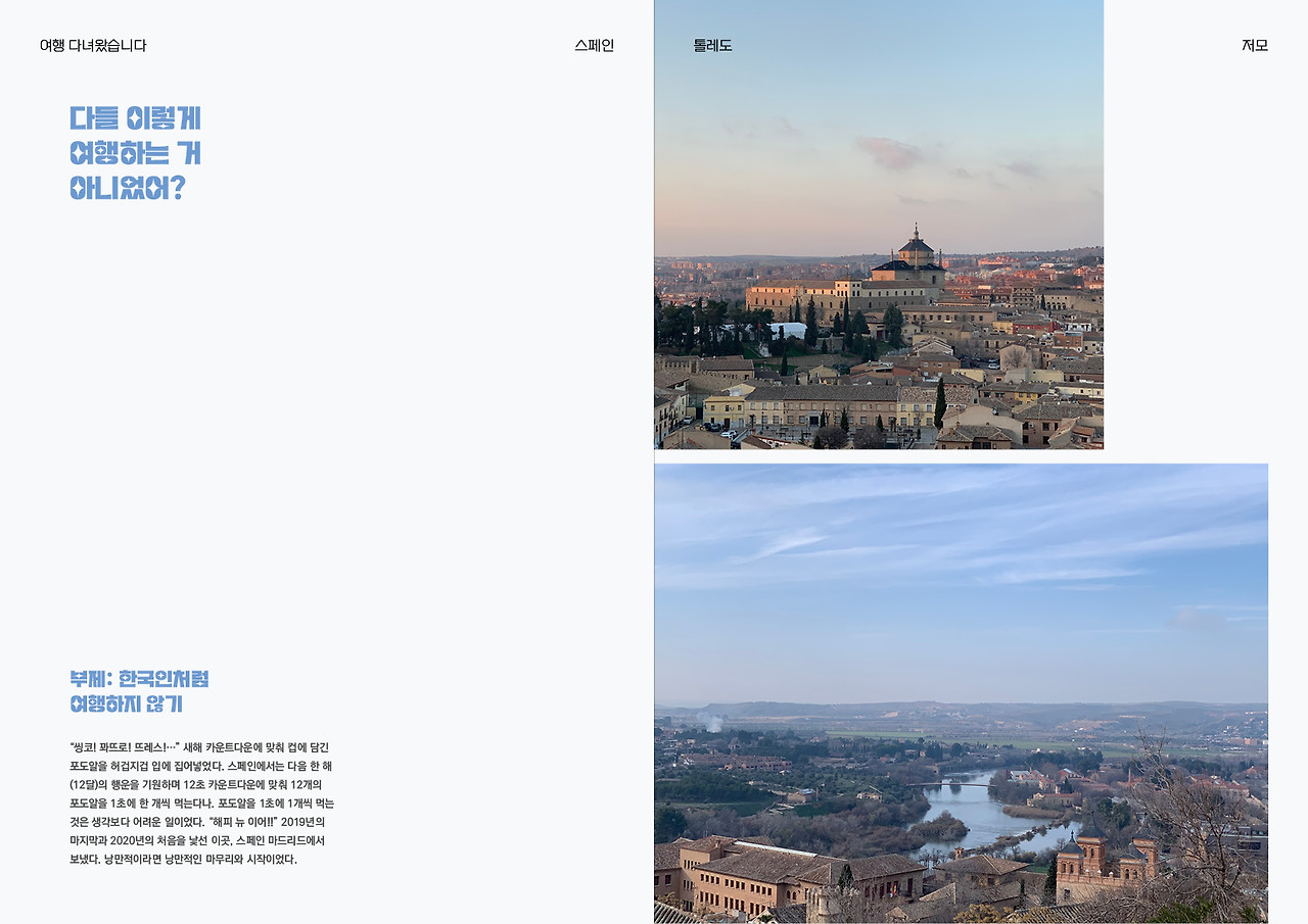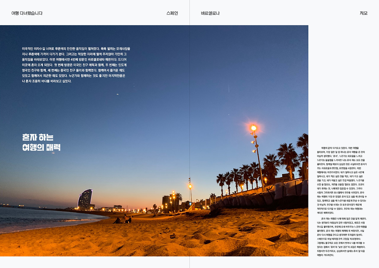 혼자 하는 여행은 나에 대해 많은 것을 알게 해준다. 나는 생각보다 독립심이 강한 사람이었고, 새로운 사람 만나길 좋아했으며, 한곳에 오래 머무르는 느긋한 여행을 좋아했다. 혼자 하는 여행의 매력에 푹 빠졌지만, 사실 다시 혼자 여행을 간다고 생각하면 두려움이 앞선다. 스페인으로 떠날 때처럼 잔뜩 긴장할 게 분명하다. 그럼에도 불구하고 모든 것에서 벗어나 나를 바라볼 수 있다는 점에서 ‘혼자’와 ‘낯선 공간’의 조합은 특별하다. 두렵지만 두근거리고, 심심하지만 설레는 혼자 할 다음 여행이 기다려진다.
