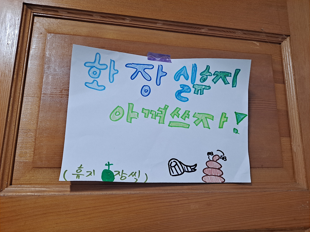 기어이 화장실 문에 문구를 붙이고 난 아이는 당당하게 가방을 매고 학교에 갔다. 막내아이 손에 닿지 못하게 문 위쪽에 붙여놓은 A4용지가 아침바람에 펄럭인다.