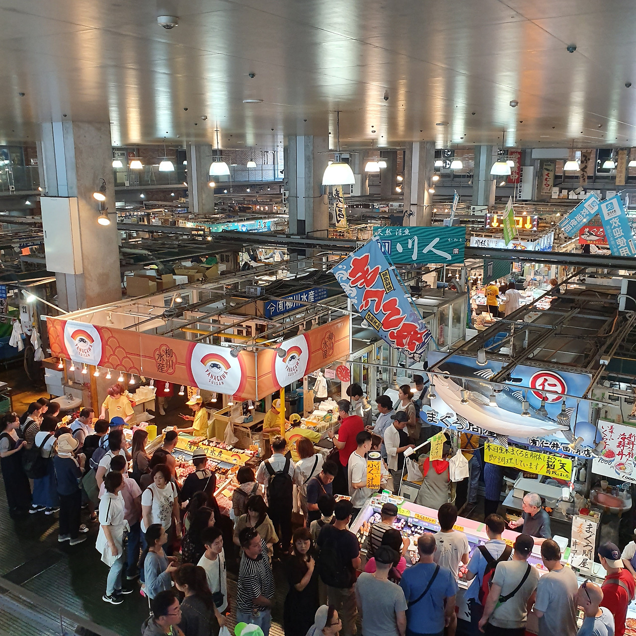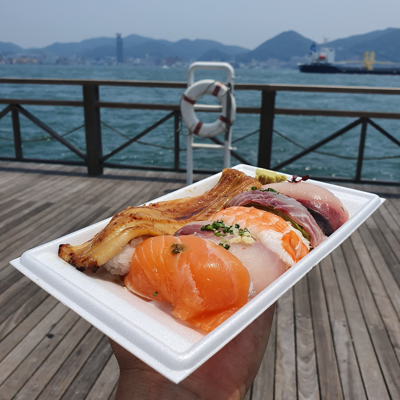 여름의 가라토 시장은 상상하기 싫은 인파였다. 하지만 사진에서도 볼 수 있듯이 초밥 위에 각종 회들이 푸짐하게 올려져 있었고, '내가 일본에 왔구나.'라는 생각을 다시 한번 실감할 수 있게 만든 음식들이었다. 북적거리는 인파를 뚫고 초밥을 구매하고 난다면 바다가 보이는 곳에 나와서 초밥을 먹을 수 있다.