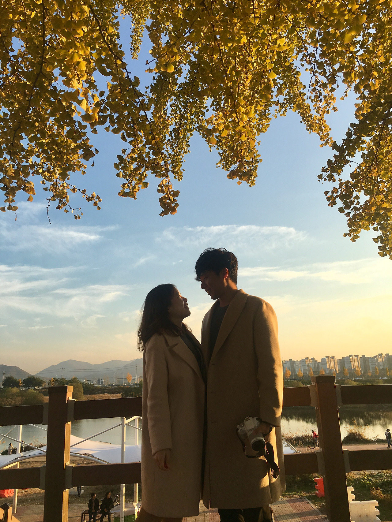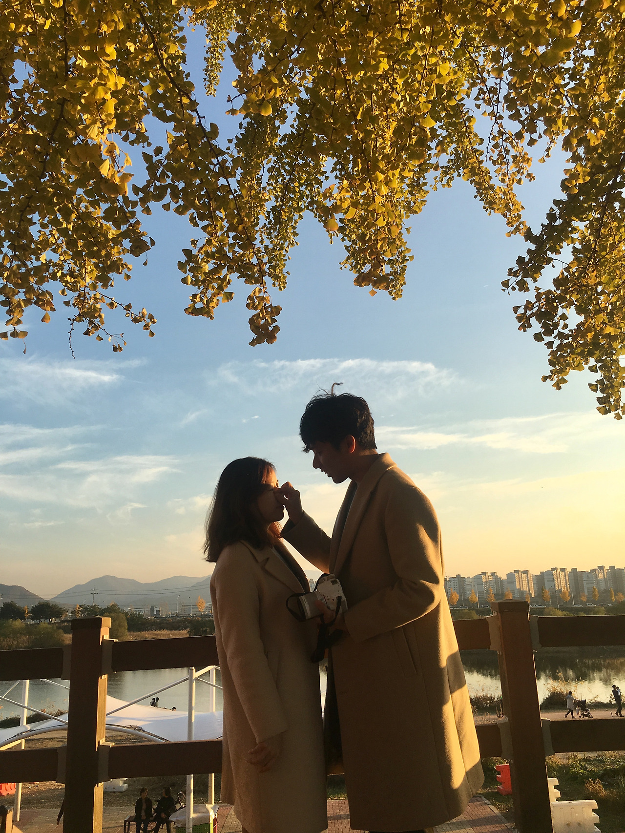 은행나무 가지가 내려앉은 천장에 노을진 하늘을 배경 삼아 울타리 벽에 기대어 서로를 바라보기.