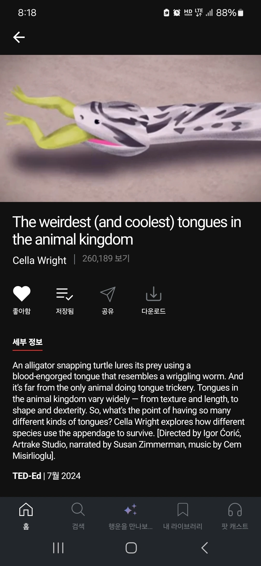 그리고 오늘 아침 TED 애플리케이션을 열었는데, 동물의 왕국에서 뱀, 개구리, 거북이, 개미핥기, 기타 등등 여러 가지 동물들의 혀의 기능과 독특한 점을 설명해 주는 영상이 추천으로 떴습니다.