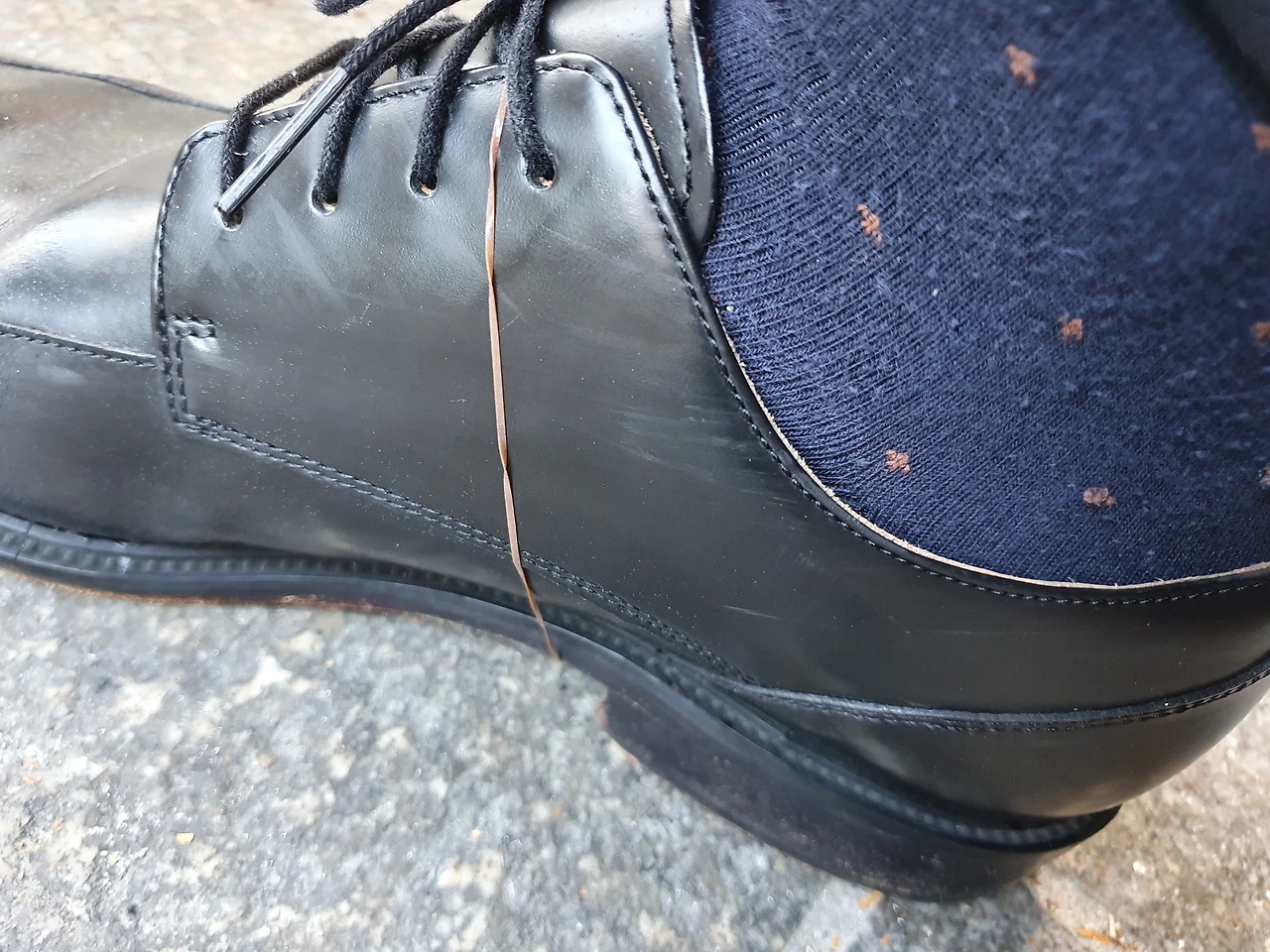 벤치에 앉아 5g 접착제를 쥐어짜서 구두 굽에 들이부었다