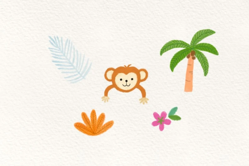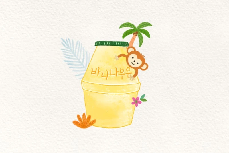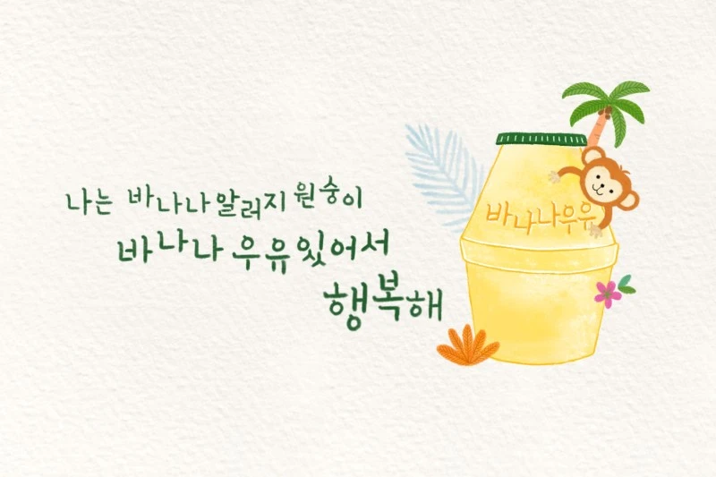 바나나우유와 함께 원숭이를 그려주고! 정글 느낌이 나도록 야자수와 나뭇잎, 꽃들을 더했어요.
