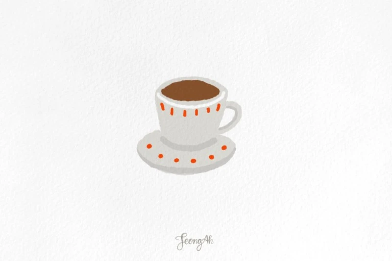 귀여운 느낌의 일러스트, 회색톤의 커피잔에 포인트로 빨간 패턴이 들어갔어요.