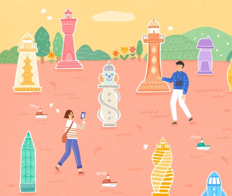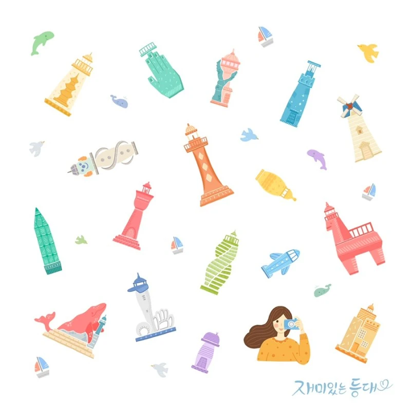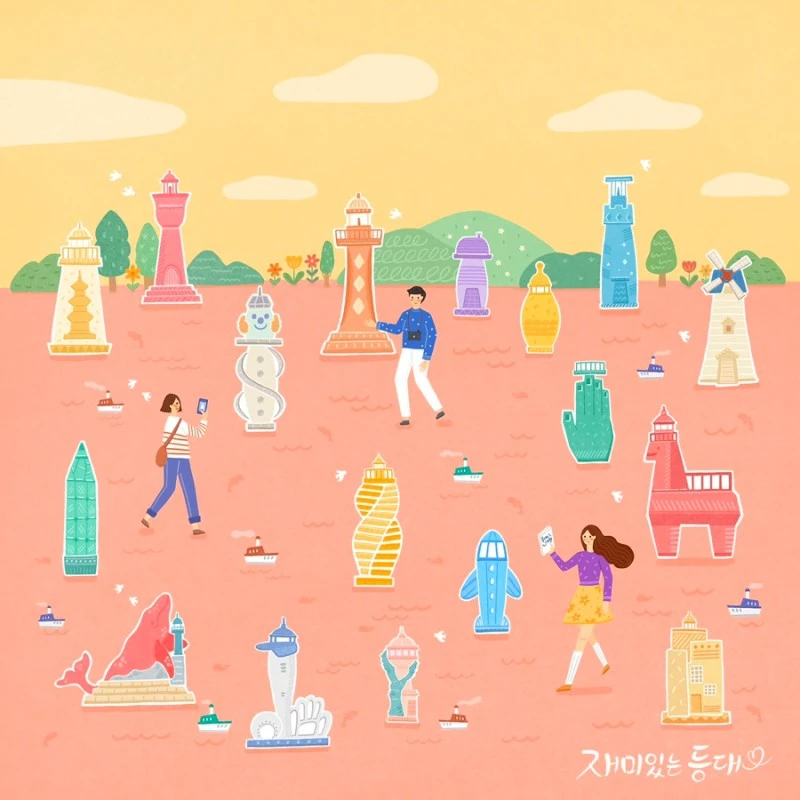 파스텔톤의 사랑스러운 느낌으로 등대를 그렸어요. 이 일러스트는 재미있는 등대 17곳을 담았어요. 등대를 바라보며 사진을 찍는 모습도 그림으로 담았어요.