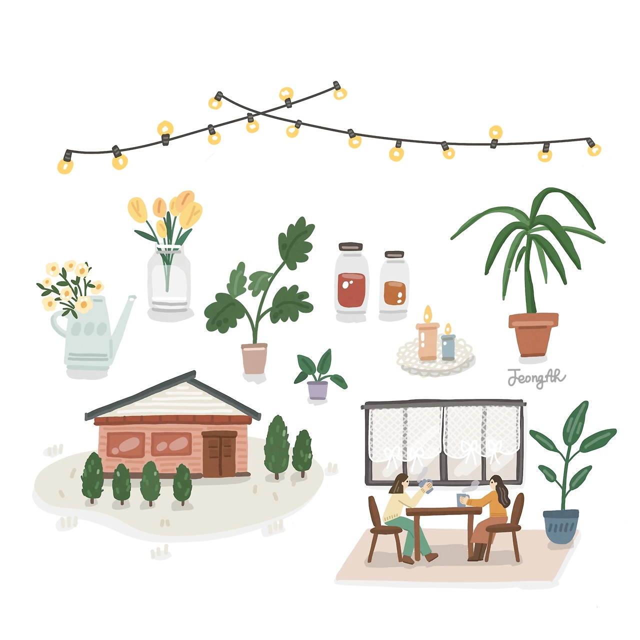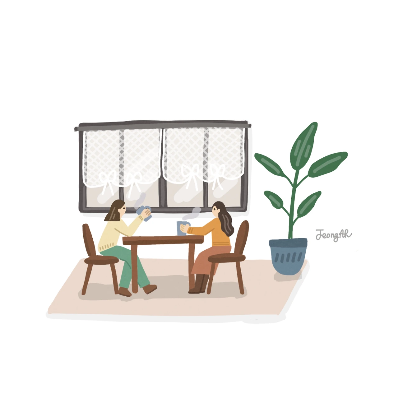 가족과 함께 하는 즐거운 커피 타임! 즐거운 시간을 일러스트로 표현했어요. 레이스커튼이 달린 창문을 그렸더니 분위기가 더욱 따스해요.