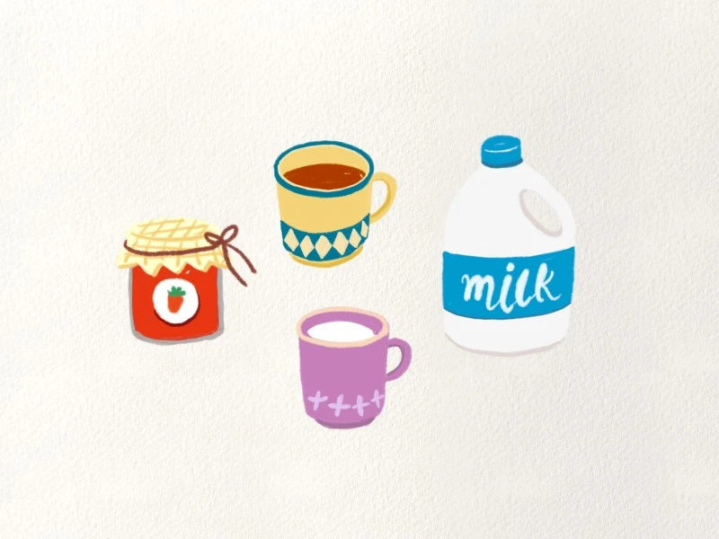 그리고 빵과 함께 먹을 음식들도 그려줬어요. 딸기잼과 커피, 그리고 고소한 우유까지요.