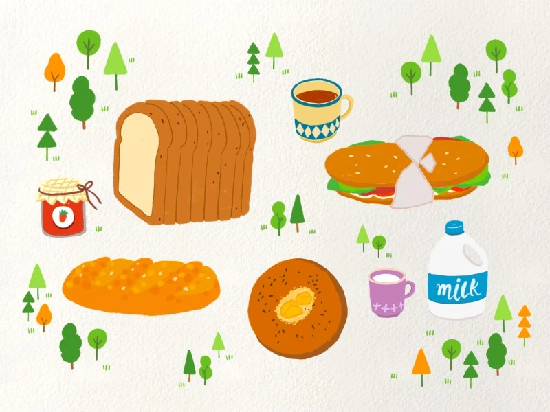 식빵과 바게트 샌드위치, 단팥빵을 그 특유의 느낌을 담아 귀엽게 그렸어요.