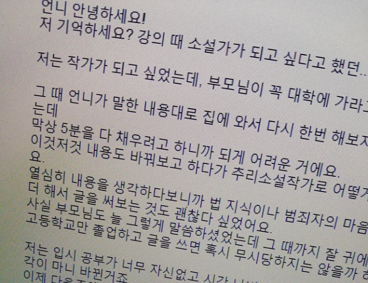 전문을 담지는 않았는데요, 요지는 소설가의 꿈을 가지고 있으면서 어디로 진학할 지 고민을 겪던 친구가 연습을 통해 더 깊게 무엇이 필요한 지를 들여다보게 되었다는 것입니다. 결국 배경지식과 경험을 더 쌓고자 법학대학에 가고자 결정했고 합격 소식을 전해 온, 기분좋은 일이었어요. 법학 대학이 뜬금없다고요? 글쎄, 누구보다도 깊이 갈등했을 그녀의 선택을 믿어 보죠!