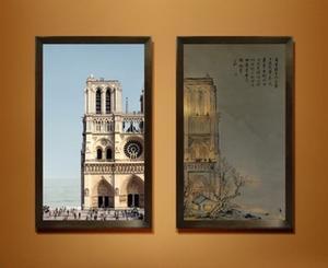 차원을 깨는 종적인 프레임 넘나들기의 예가 위와 같다면, 그림이라는 횡적인 프레임끼리 넘나드는 예는 여기에 있습니다. 미디어 아티스트 이이남씨의 작품들은 커다란 LED 화면을 무대로 동서고금의 명화 속 장면들이 중첩되어 어우러지는 것으로 유명합니다.