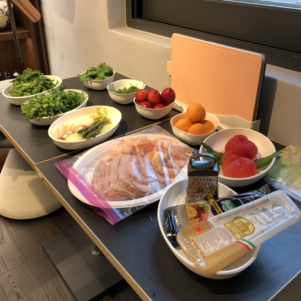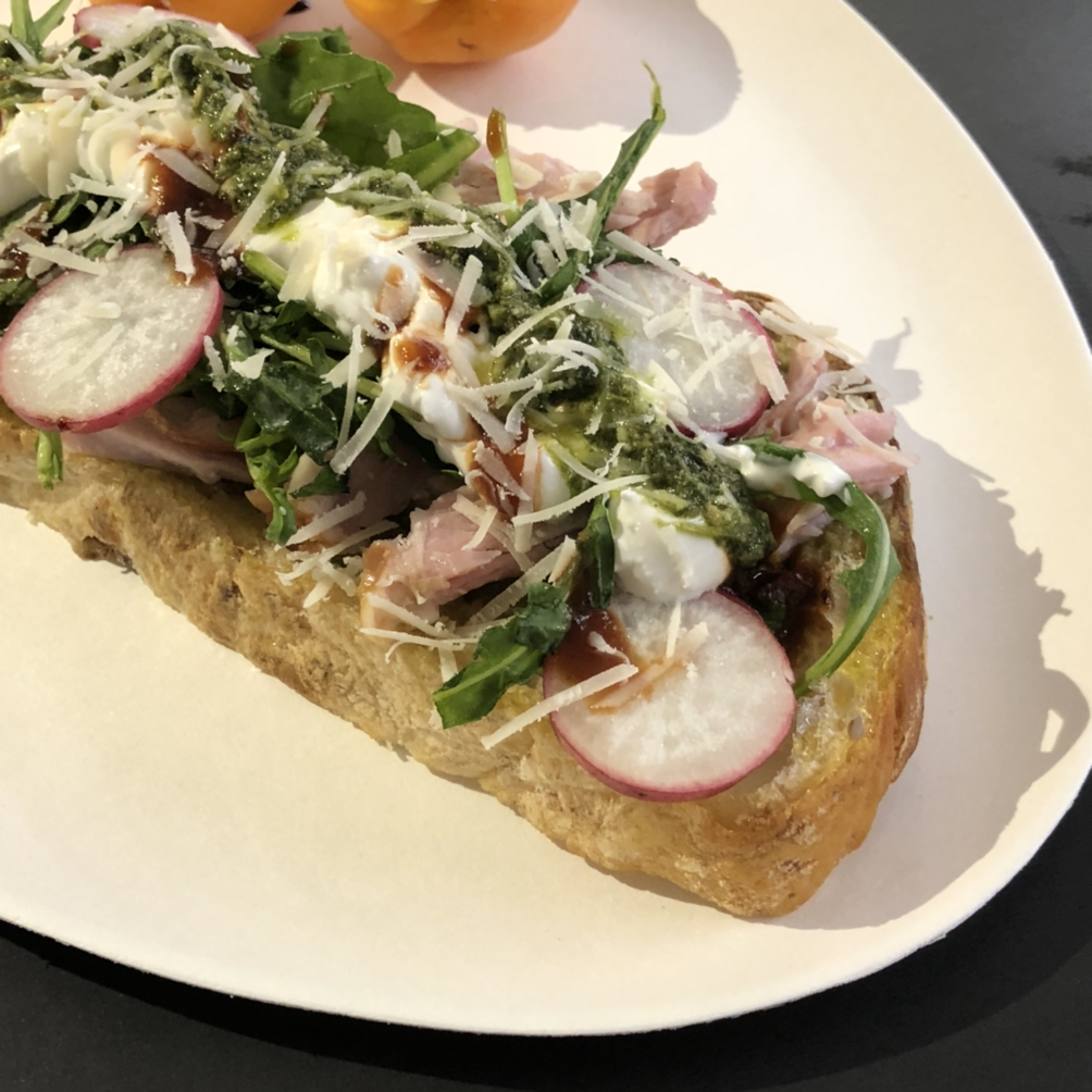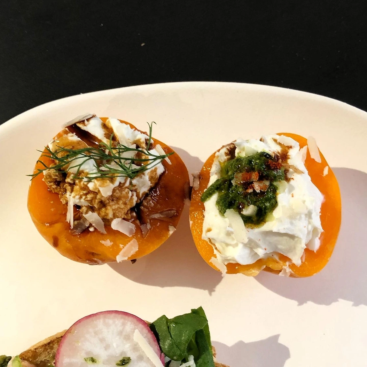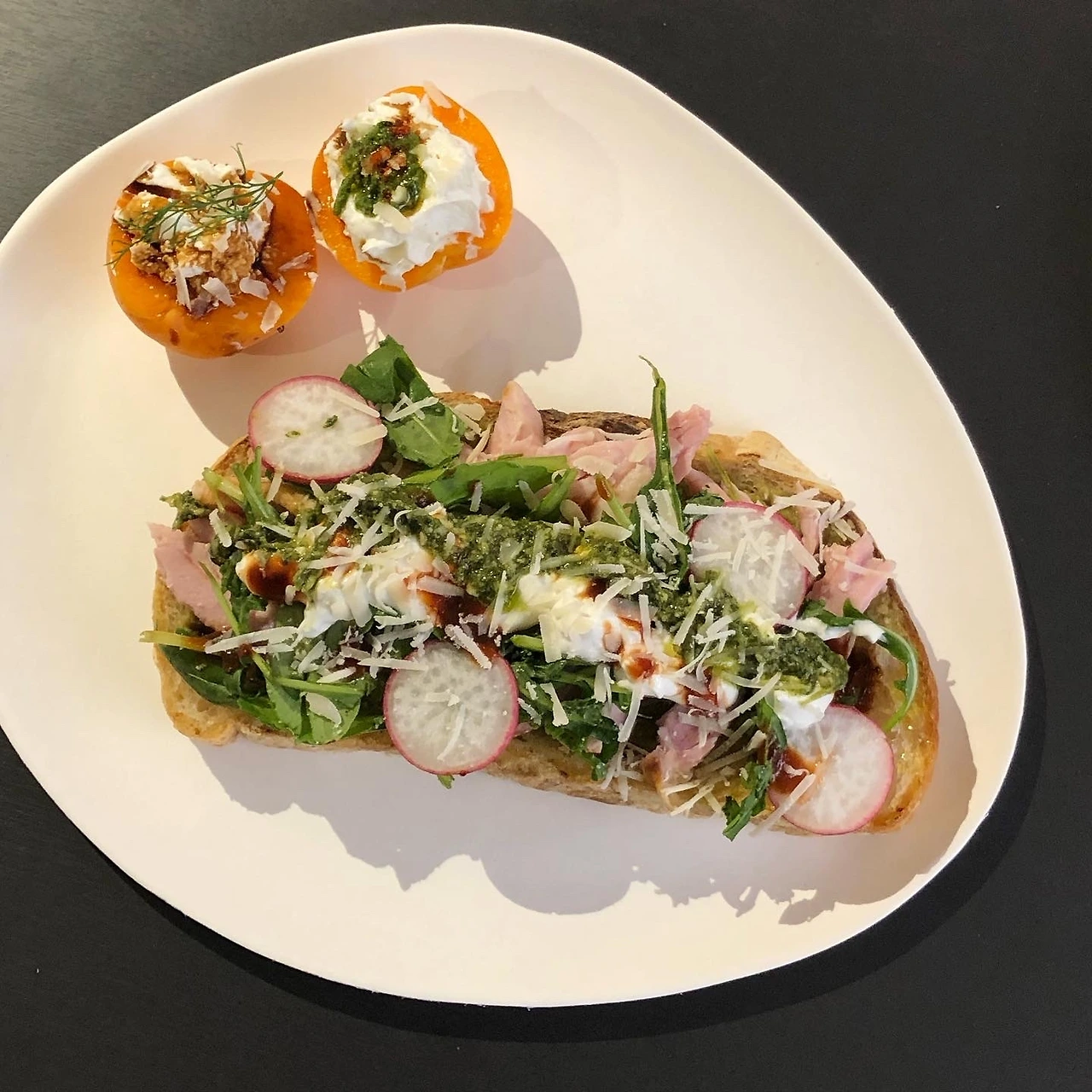 내가 뽑은 주제는 "기억에 남는 휴가"로, 퇴사 후 한 달간 미국을 여행한 기억을 떠올리며 추억의 재료로 접시를 채웠다. 널찍한 깜빠뉴 위에 올리브유를 뿌리고 후무스의 텍스쳐를 닮은 완두&아스파라거스 페스토를 발랐다. 그리고 그 위에 루꼴라, 래디쉬, 잘게 찢은 햄, 사워크림과 치폴레 소스를 올린 다음 깻잎 페스토로 마무리한 오픈 샌드위치. 사이드 겸 후식도 있으면 좋을 것 같아 살구에 그릭요거트를 채우고 하나는 페스토, 하나는 무화과 발사믹을 뿌린 다음 딜로 장식해주었다.